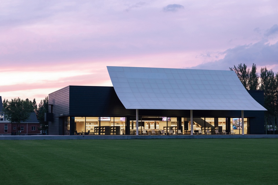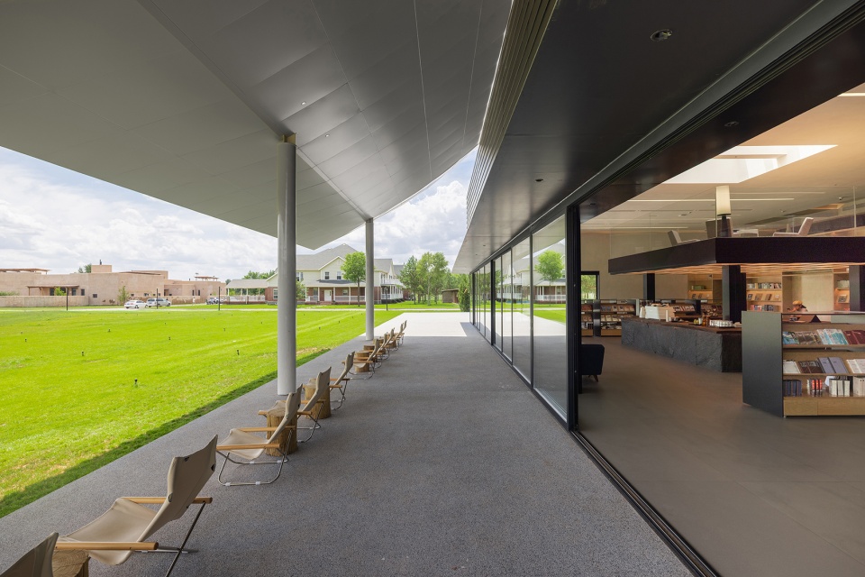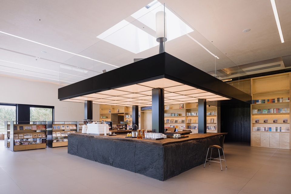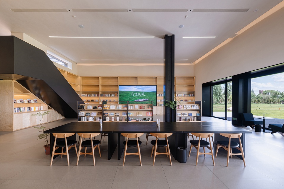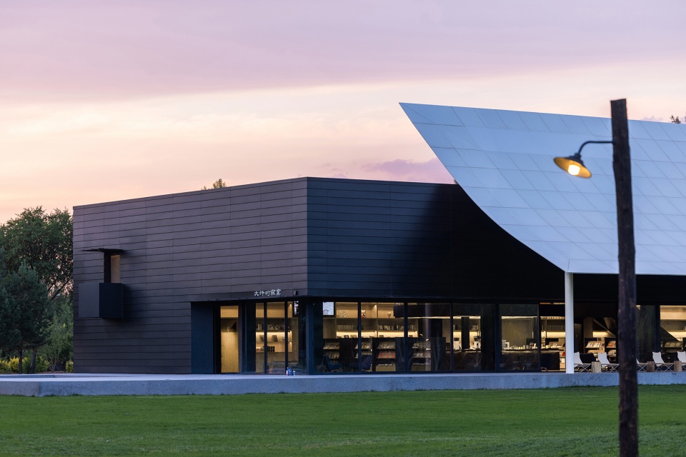 The original building of “The Great Khan’s Loneliness” was a pure steel structure glass box, surrounded by large areas of grassland. Taking the “tie” which means paper from the concept of bookstore’s name, we removed the original glass facade and only retained the structural framework. Then, we re-wrapped it with black aluminum plates in an array to form an integrated black building block. Compared with the original glass, aluminum plate material can also save energy better.