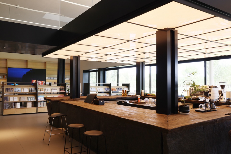 A bookstore is a cultural center and essentially a place for communication. The circular coffee bar counter is the core of the entire store, located in the center of the first floor, offering a view that combines both indoor and outdoor Spaces. The cabinet body is made of dark natural weathered stone veneer, and the countertop is made of old wooden boards. Above the island-circling bar counter, a corresponding indoor ceiling was designed and fabricated, illuminated with resin boards containing Xuan paper, and also created a unique aerial tasting area for the whisky on the second floor.