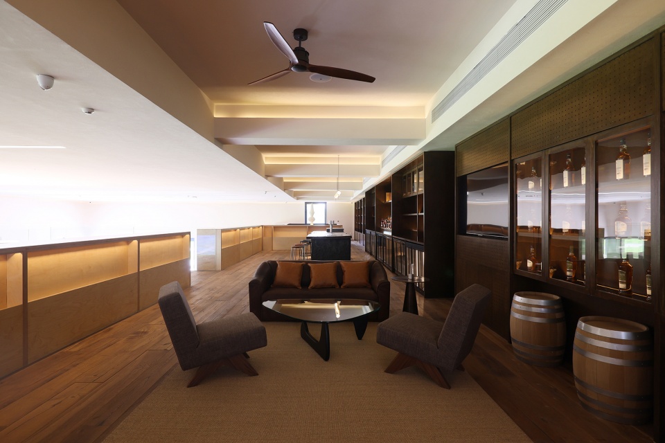 建筑的空间层高非常理想,因此我们在室内局部搭建了二层作为“威士忌”品鉴区。与一楼的浅色不同,二楼选用深色以示产品的区分,也营造出威士忌更为优雅的沉淀。整面酒墙自东向西贯穿二楼,客人既可以在吧台欣赏交流,也可在沙发区身心放松地落座品尝。