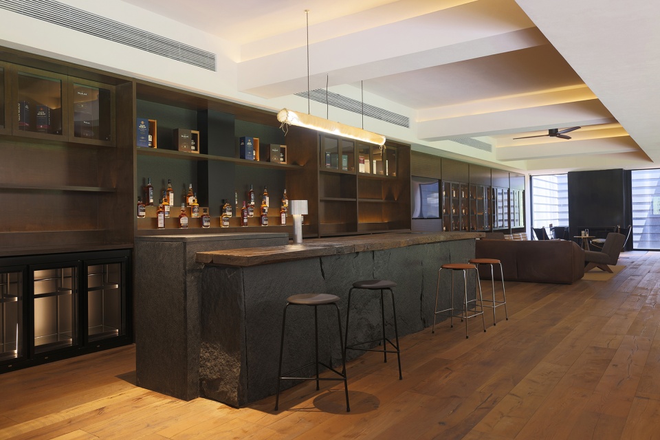 The height of the building’s space is very ideal, so we have partially built the second floor inside as a “whisky” tasting area. Unlike the light colors on the first floor, the second floor uses dark colors to distinguish the products and also create a more elegant and mellow flavor for the whisky. The entire wine wall runs from east to west across the second floor. Guests can either enjoy and chat at the bar counter or relax and sit down in the sofa area to taste.