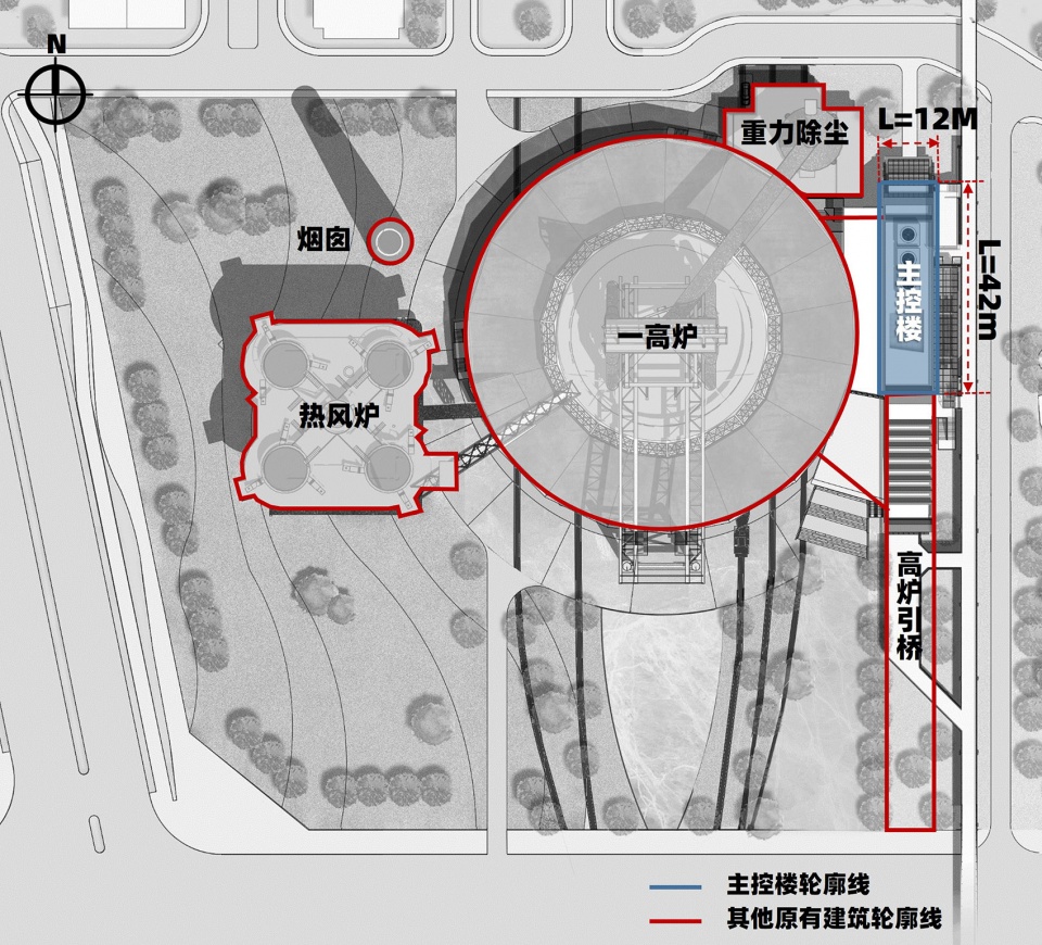 设施取舍优化:梳理整合附属设施,保留高炉本体、热风炉、重力除尘器等核心工业遗存,对低效控制楼按“正投影不变”原则原地重构,同步引入符合时代特征的功能造型元素,实现“新旧共生”;