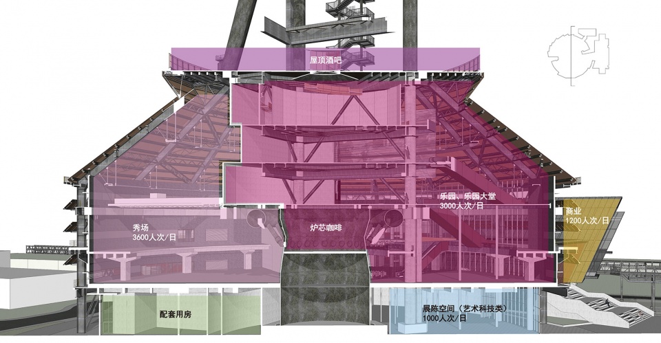 Space Reorganization and Reconstruction: Open the furnace core and add floors to transform the former large iron-making process space into a high-density vertical space adapted to entertainment and leisure functions. It not only retains the industrial texture, but also meets the needs of modern experience;