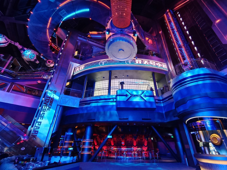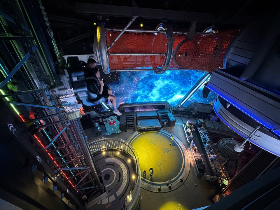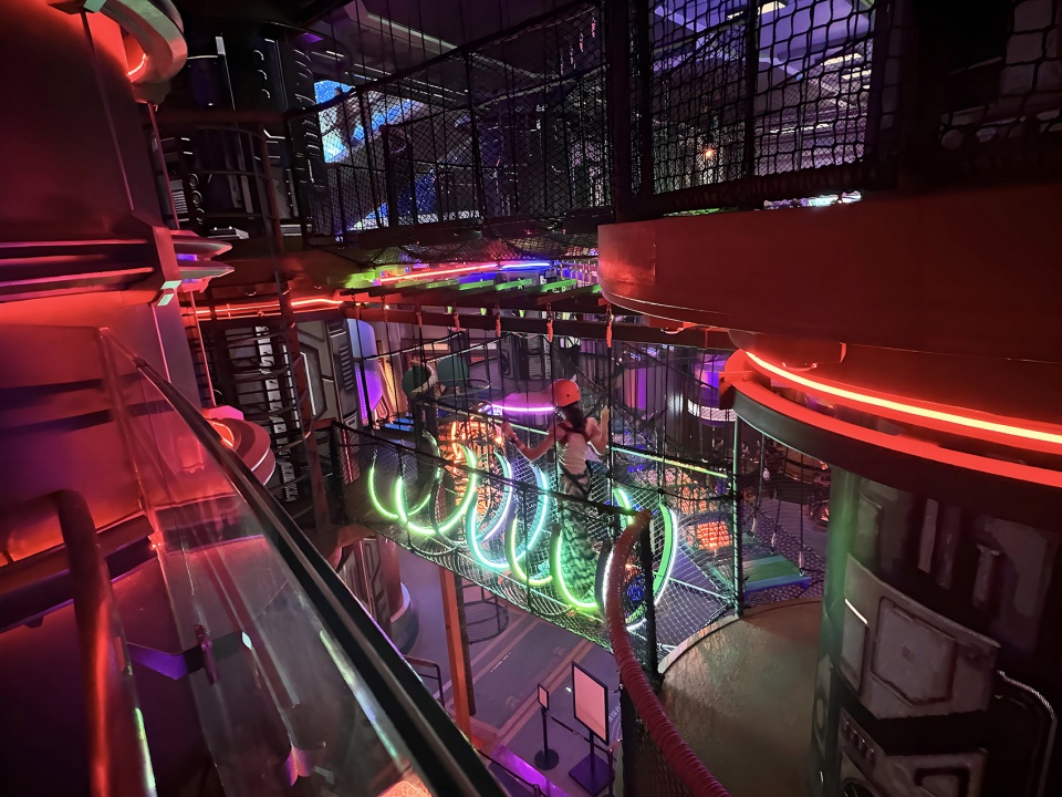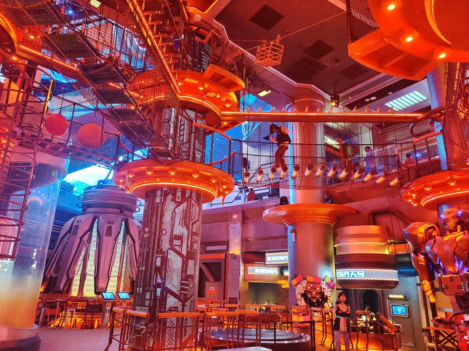 南侧为科幻乐园区,聚焦动态互动体验,二至六层垂直分布载具体验、跳楼机、无动力滑索、高空探索、攀岩救援、绳网虫洞等数十种项目,以及生态秘境、齐天号观测中心等互动科技体验区,游客可化身 “星际探险家”,在高低错落的空间中穿梭嬉戏,尖叫与欢笑交织,热闹氛围贯穿全场。