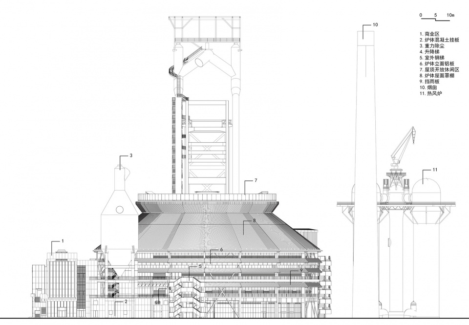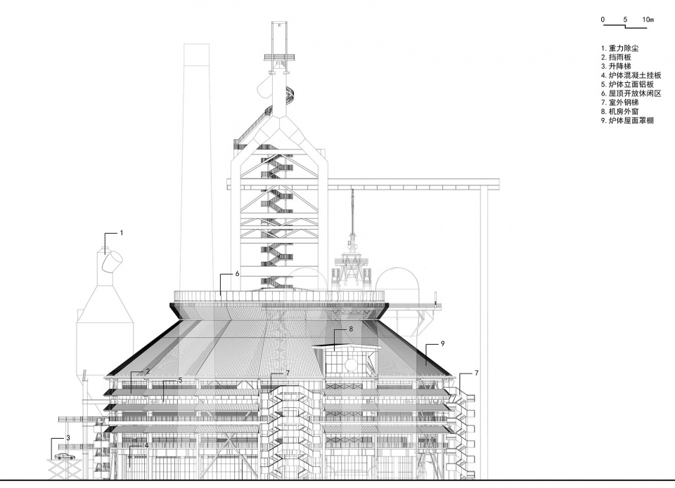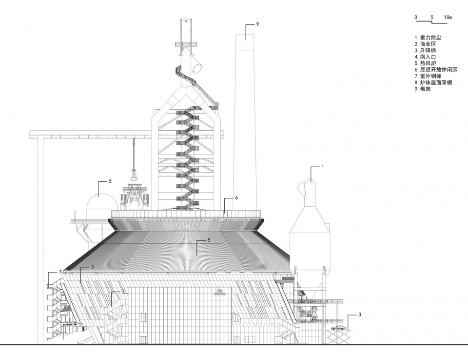 Facility Selection and Optimization: Sort out and integrate ancillary facilities, preserve core industrial heritage (including the blast furnace itself, hot blast stoves, and gravity dust collectors). The inefficient control building is reconstructed in situ according to the principle of “orthographic projection unchanged”, and simultaneously introduce functional and stylistic elements that reflect contemporary characteristics, achieve “old and new symbiosis”;