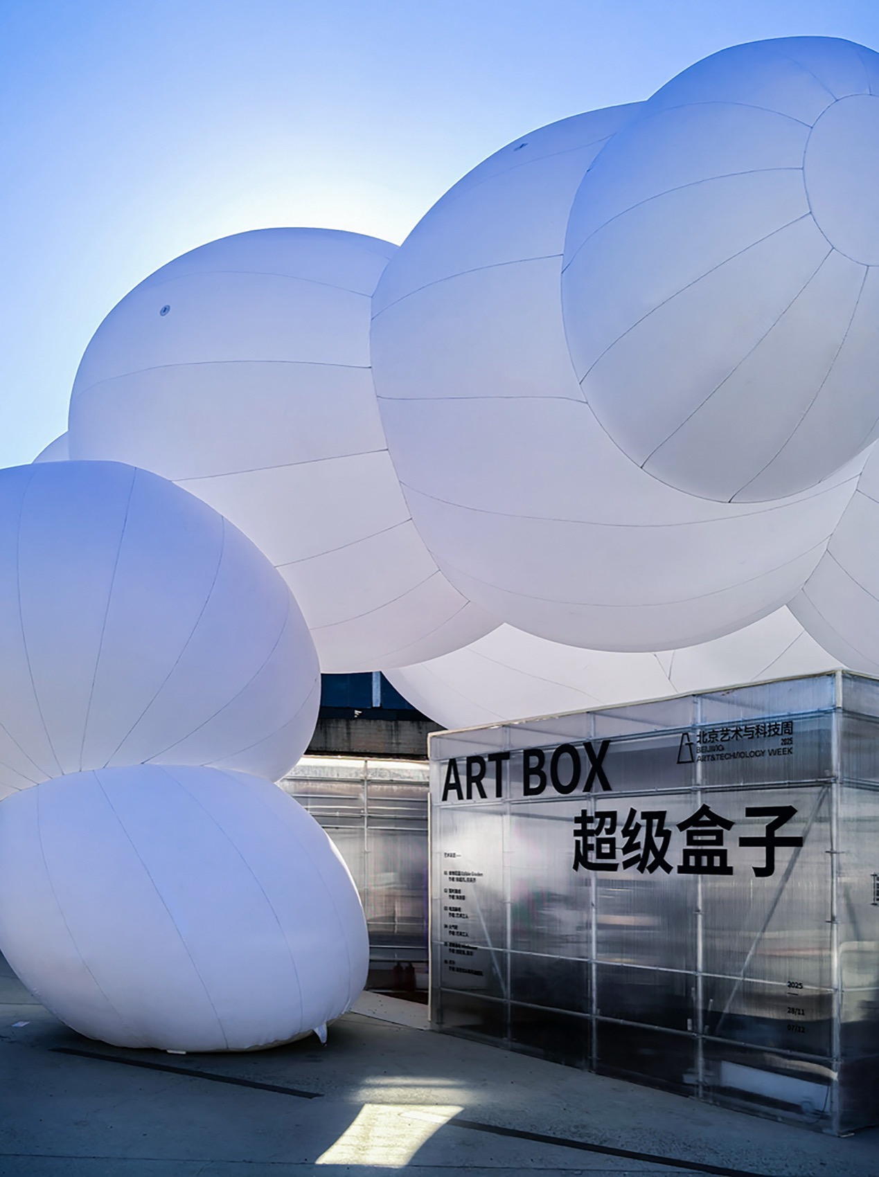 这是一个设计周期短、展期仅为15天的项目,需兼顾快速搭建与展后物料回收。我们选用盘扣式脚手架、阳光板与气模的组合构建装置,展示艺术家关于科技与艺术的装置作品。展陈空间既延续科技的硬核质感,也试图成为科技与人文之间的柔和介质。