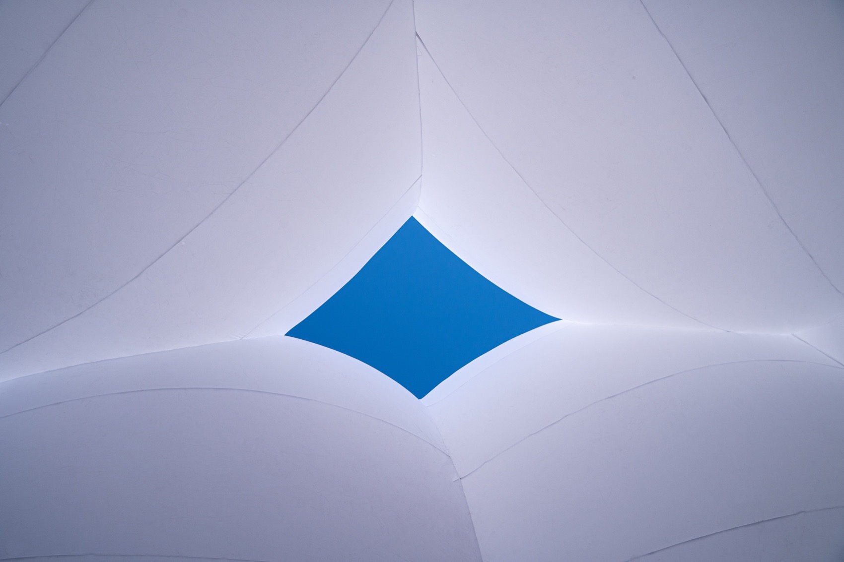 设计通过几组对比关系凸显主题:理性与感性、刚硬与柔软、直线与曲面。方与圆、规则与圆融在此并置。云朵气模占地182平方米,顶高9米,以三个落地支点形成稳定的结构体系,两两之间内蕴拱形力学形态,既为装置提供支撑,又塑造出轻盈的视觉轮廓。气模顶部设有一处菱形天井,不仅丰富空间形态,更有效引导气流疏散,避免“帐篷效应”带来的风压风险,显著提升整体抗风性能。三处支点底部以配重稳固,确保在大风天气中基部岿然不动,而顶部则能如呼吸般轻微摇曳,赋予装置一种生动的结构表情。
