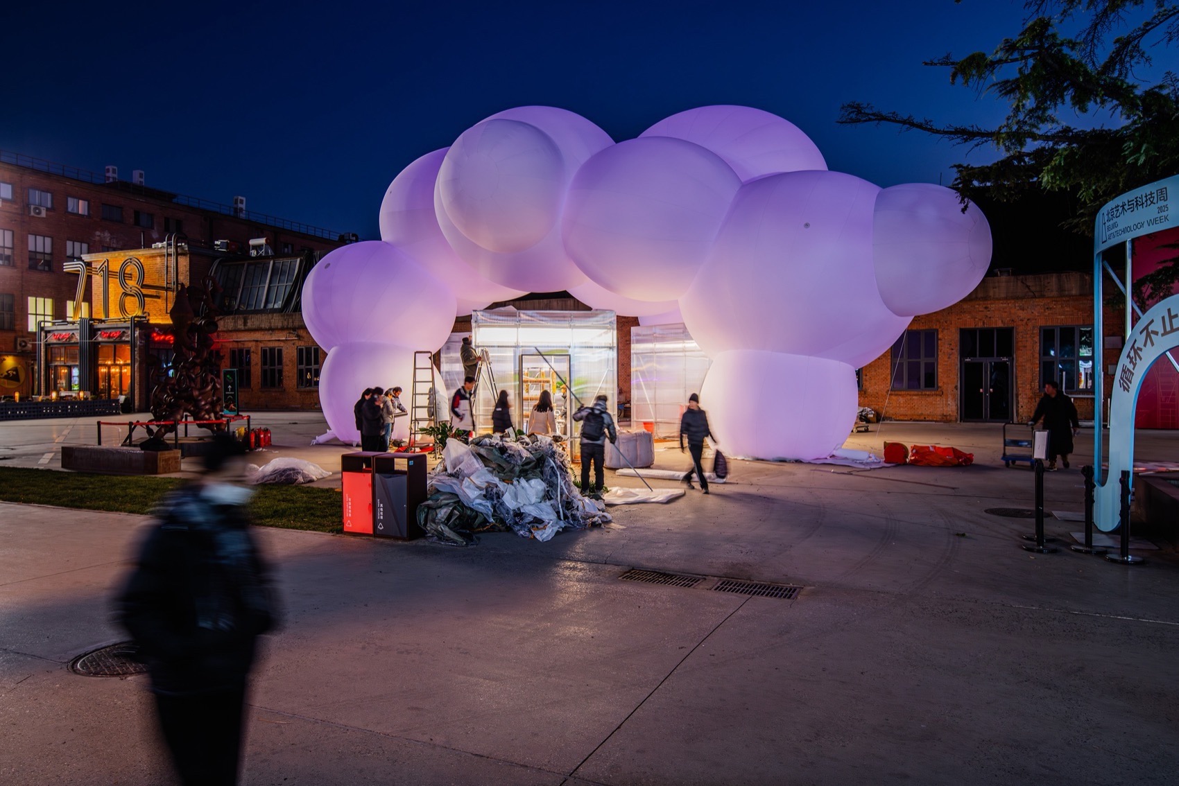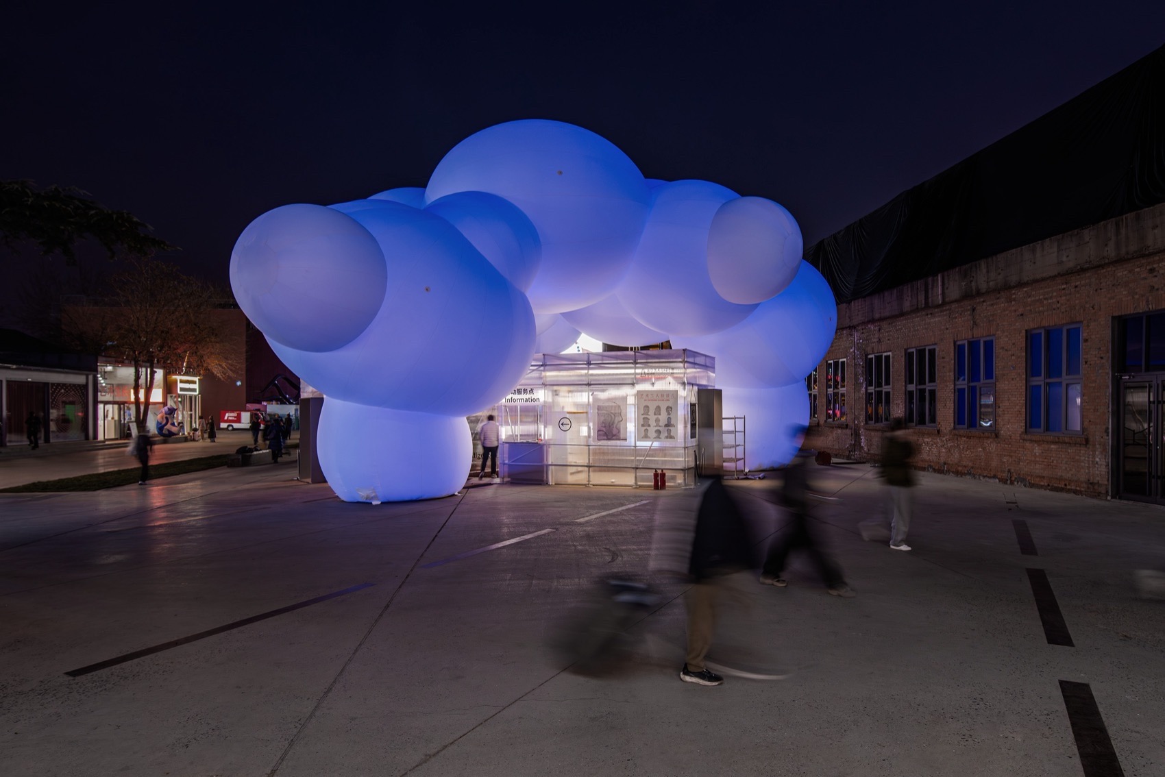 This structural logic naturally defines a large, in-between gray space, integrating with the three exhibition volumes below to outline a soft, ambiguous boundary. Building upon this framework, lighting embedded within the inflatable membrane changes color with a rhythmic, breathing pattern. This personification imbues the structure with a sense of life, softly bridging the industrial ambiance of the 798 neighborhood with the technology-laden exhibits within.