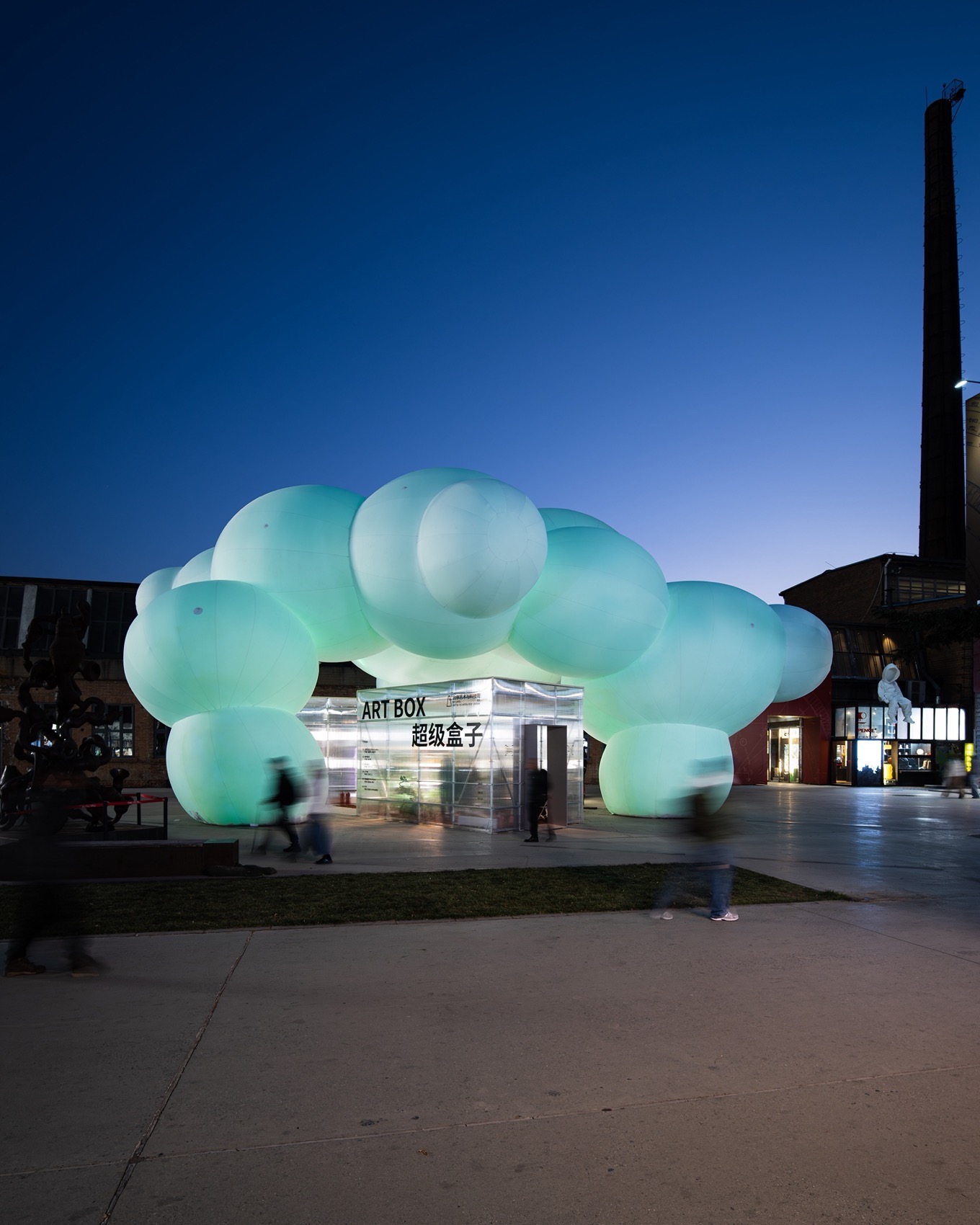 The design highlights its themes through several sets of juxtapositions: the rational versus the perceptual, the rigid versus the soft, straight lines versus curved surfaces. Square and circle, rule and fluidity are placed side by side here. The cloud inflatable, covering 182 square meters and reaching a peak height of 9 meters, establishes a stable structural system through three ground-contact points. Spanning between each pair of support points is an arched structural logic, which is integrated within the overall form to provide essential support while contributing to a visually light silhouette. A diamond-shaped void is set at the top of the inflatable. This feature not only enriches the spatial form but, more critically, effectively guides airflow and ventilation, mitigating wind pressure risks associated with the “tent effect” and significantly enhancing overall wind resistance. The bases of the three points are secured with ballast, ensuring immobility at the foundation during high winds, while the top can sway gently like a breath, lending the structure a lively, expressive quality.