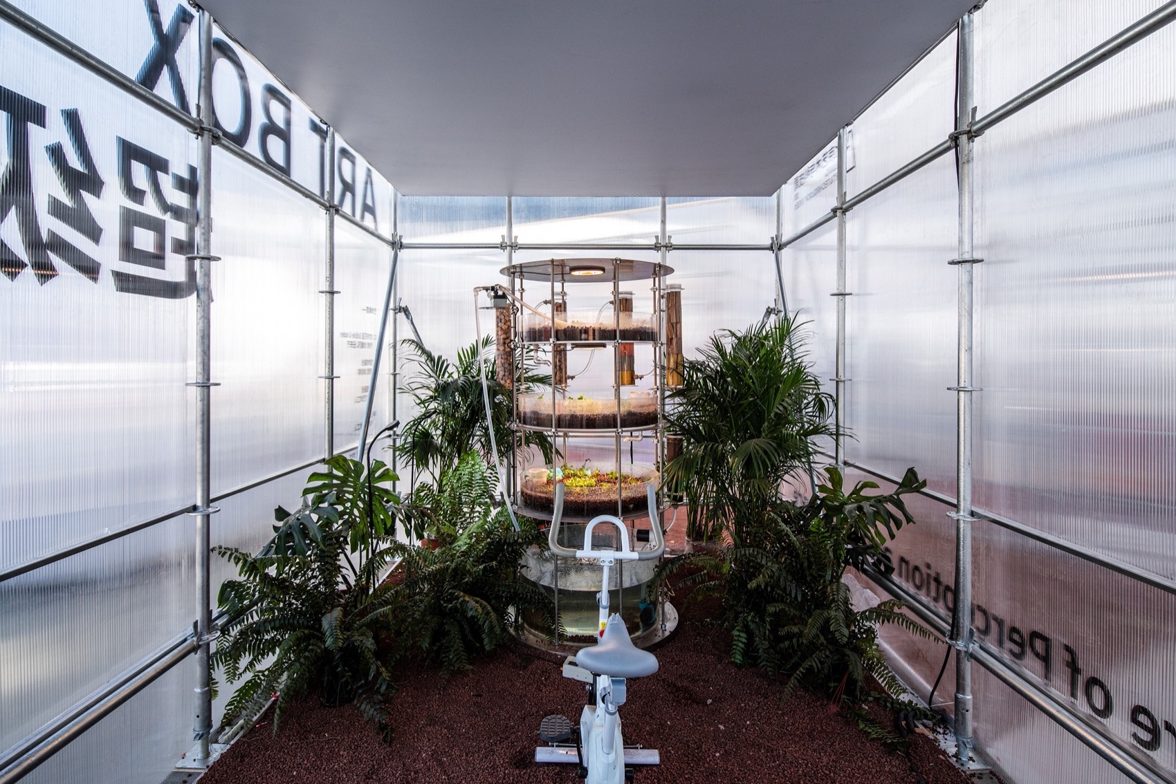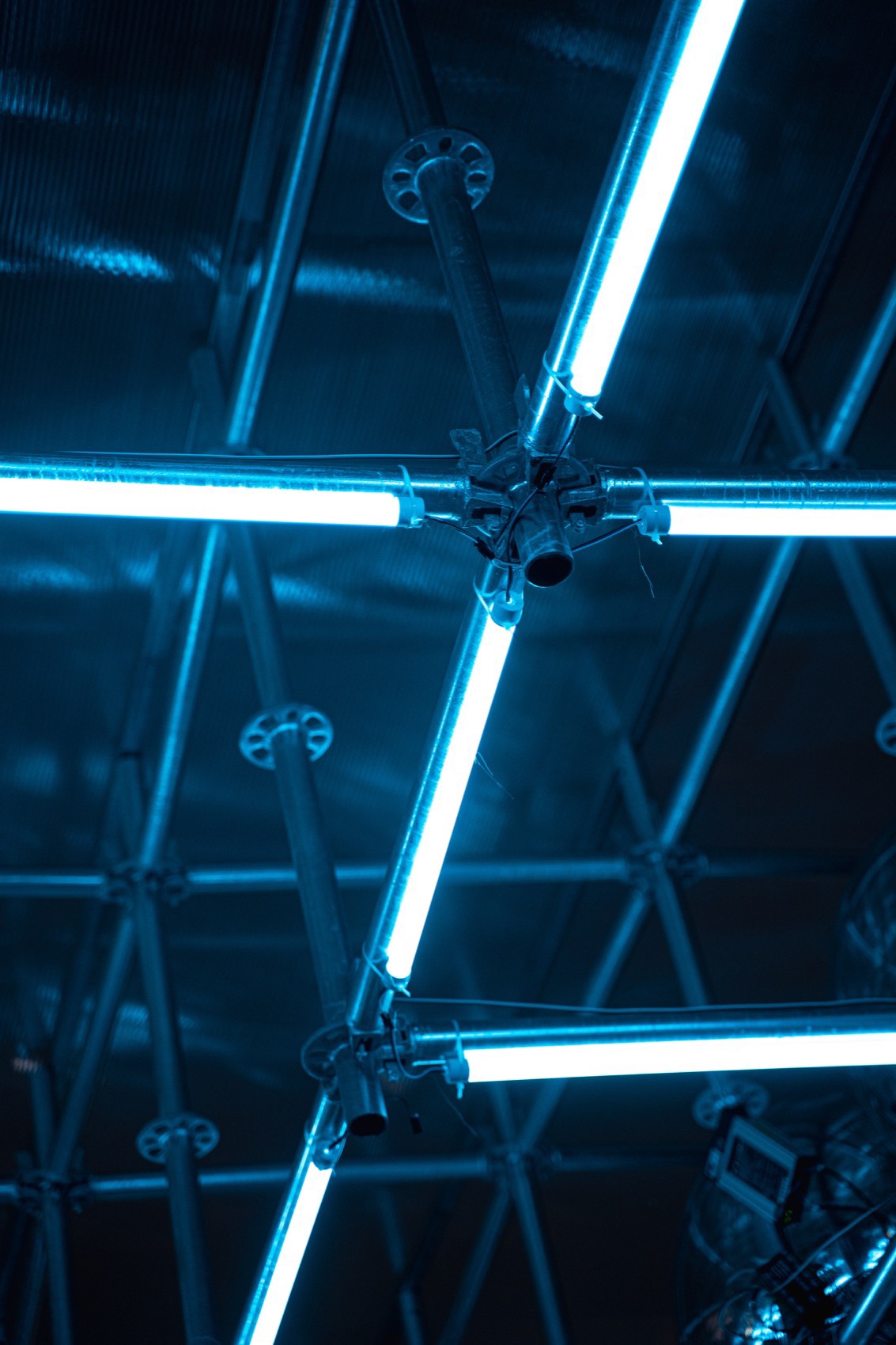 This was a project with a short design and production timeline, as well as an exhibition period of only 15 days, necessitating a balance between rapid assembly and post-exhibition material reclamation. We employed a material palette of cup-lock scaffolding, polycarbonate panels, and an inflatable membrane to construct the installation, which housed artworks that explore the intersection of technology and art. The exhibition space seeks to extend the hardcore sensibility of technology while serving as a mediator between tech and humanity.