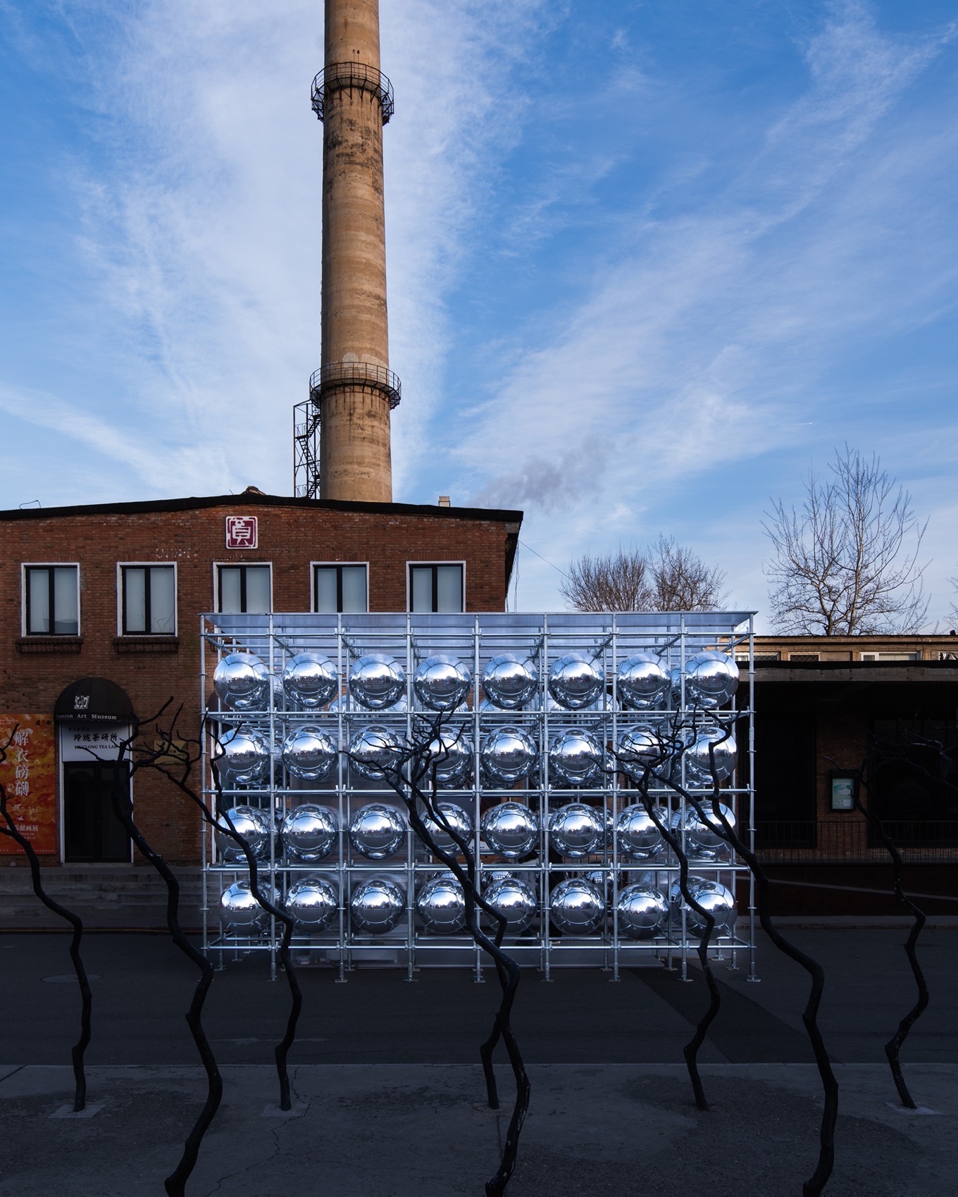 框架界定出多个0.9×0.9×1米的立方单元,在如此秩序之中,每个单元内嵌入直径75毫米的银色镜面球体。球体反射周围万物,彼此之间更互映成象,构筑出一个视觉上无限延伸的空间。这种混沌而无限的意象,既打破了既定秩序,又重塑了新的秩序。环境、展品与观者共同进入镜像世界,在此虚拟维度中交织共存。