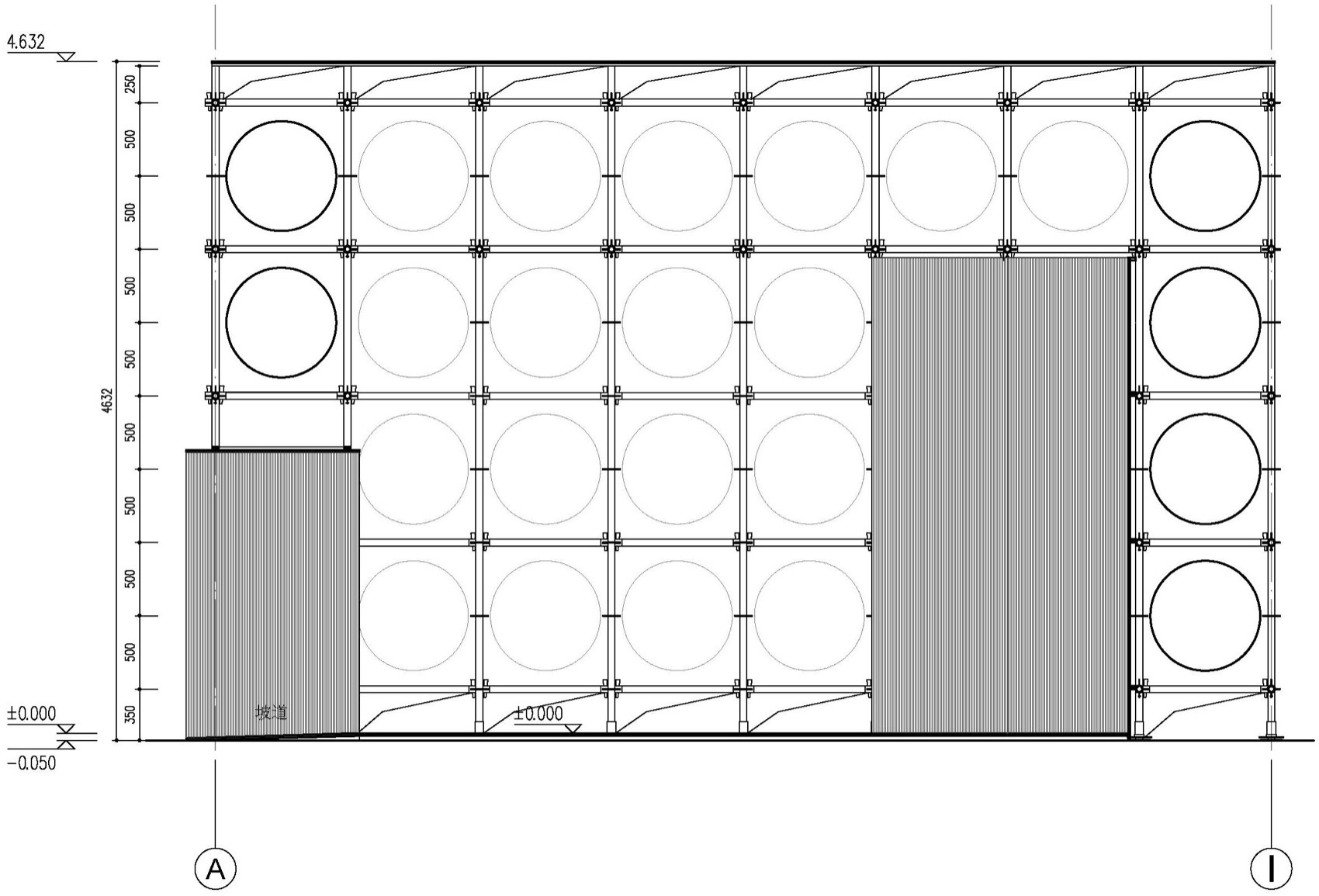 Also constructed from cup-lock scaffolding, polycarbonate panels, and an inflatable membrane, “Mirror World” emphasizes the dialectic between order and chaos. Through in-depth study of the scaffolding system, we established a 0.9-meter module to build the primary frame—9 bays horizontally and 7 bays vertically—creating a grid space with a strong sense of order. This modular system allows for flexible adjustment of spatial dimensions according to exhibition needs and site conditions.