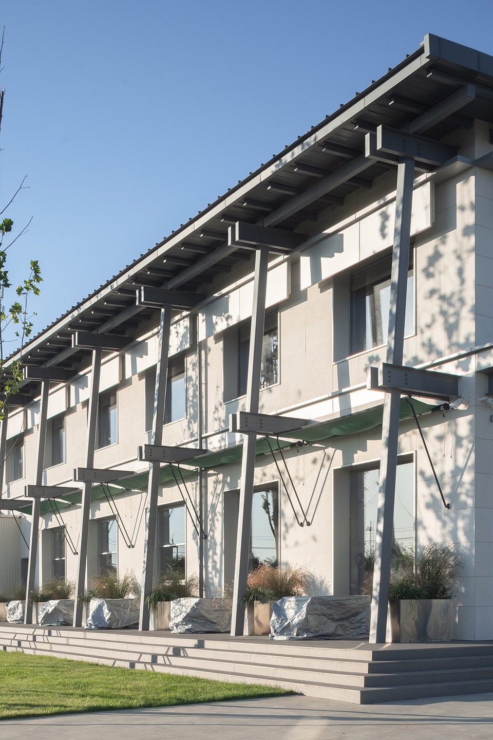 建筑设计采用融合的现代手法,主体结构为轻量、快速的钢结构体系,兼顾经济性与施工效率。通过较大跨度悬挑屋顶、通透的立面处理以及现代材料如复合板材与阳光板的运用,营造简洁、干净、富有禅意的建筑氛围。