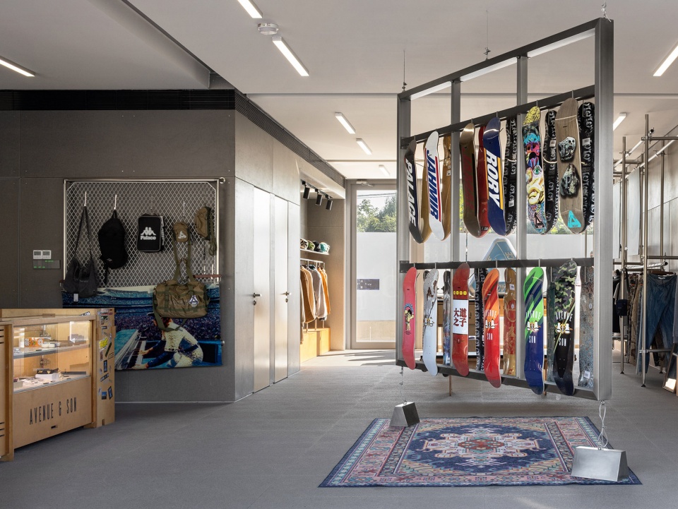 The AVENUE&SON store continues the building’s clean industrial aesthetic. Despite limited budget and time, Various Associates sought to present a cohesive vision of street culture. Minimalist design language and reused display fixtures from the brand’s previous pop-ups create a clean, relaxed street atmosphere.