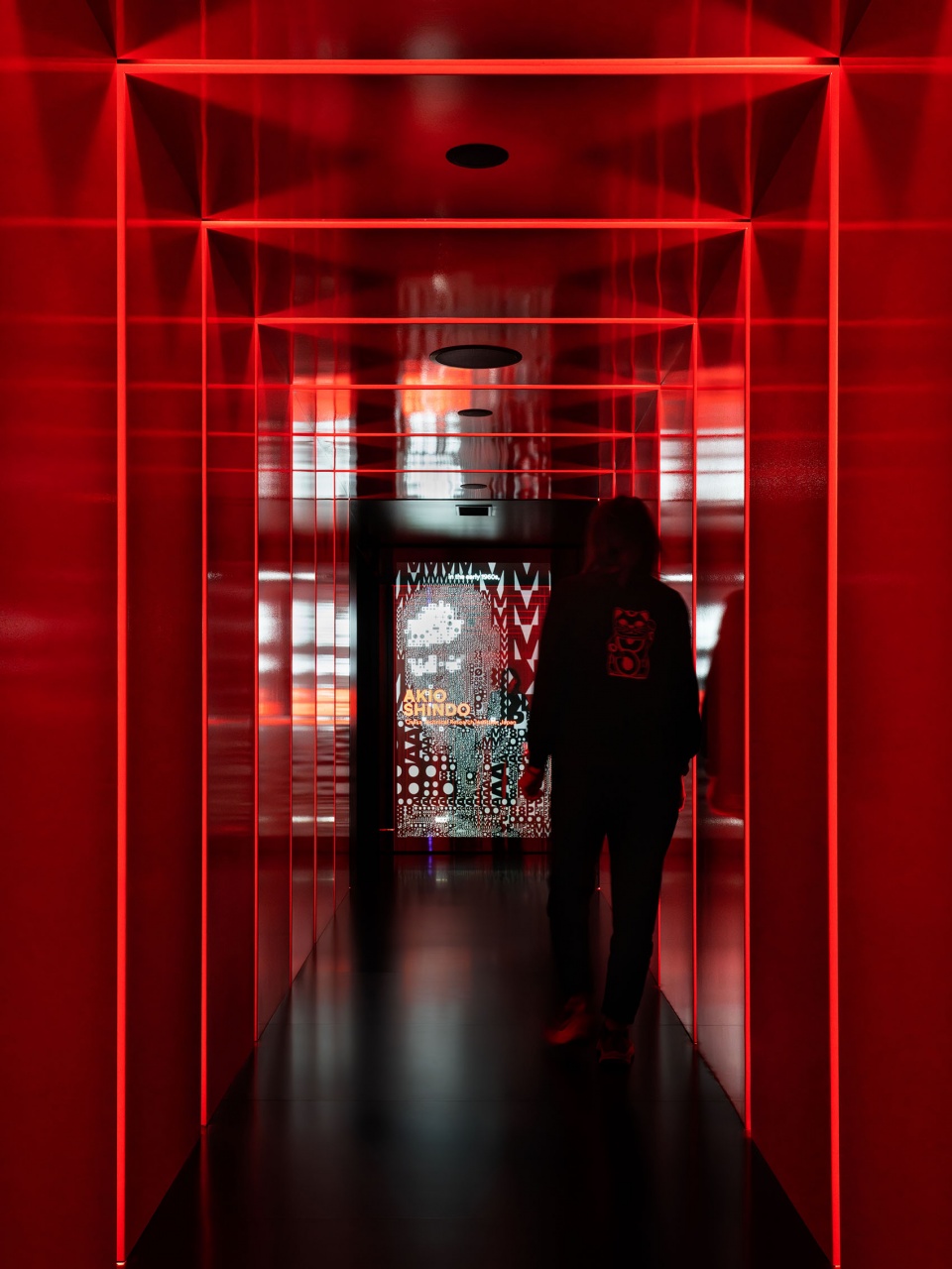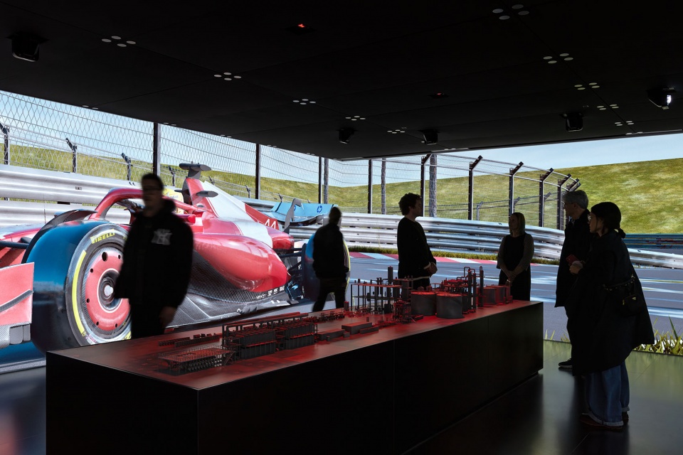 参观动线随后进入“碳化隧道”,通过热与光的演绎,重现丙烯酸纤维转化为碳纤维的过程。在这里,建筑成为传递力量的媒介——压力、压缩与释放被转译为一场多感官体验。来自 MAE 测试设施的实时数据将博物馆与正在进行的研究相连,使其成为一座“活的实验室”。此外,一个沉浸式空间展示了碳纤维潜力的最前沿:一座完整的生产工厂模型在上方投射的增强现实中被“激活”。