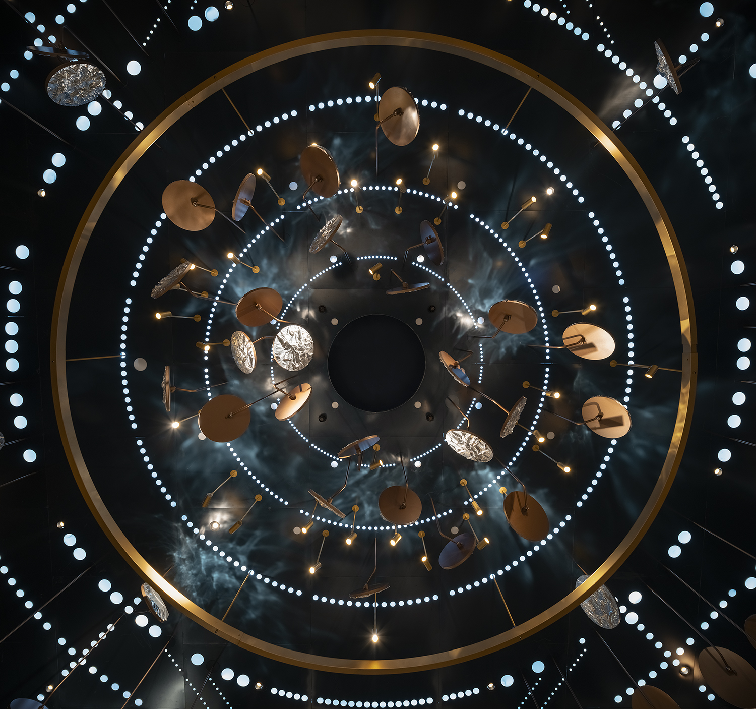 并且以点、线、面为基础构思,运用RGB 灯光颜色可编程及其能不断变幻的特性,搭配圆盘组建为宇宙星盘的意象。