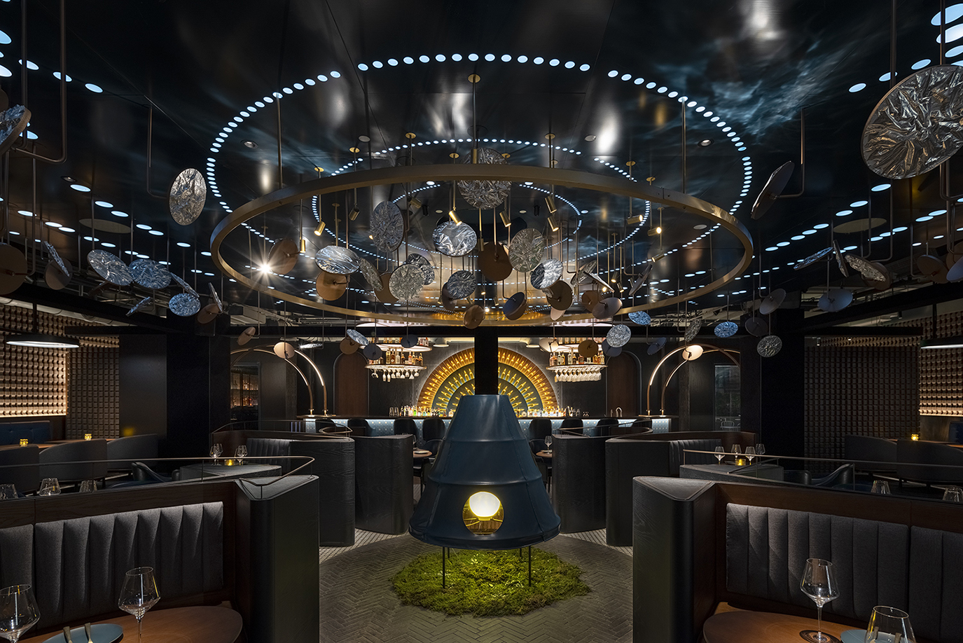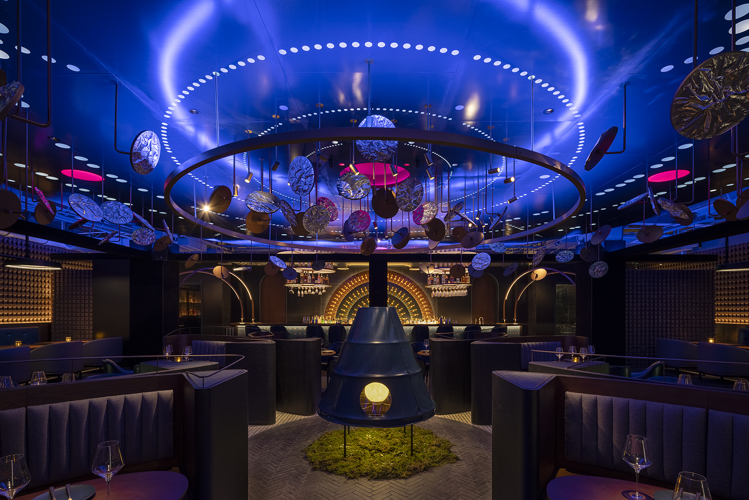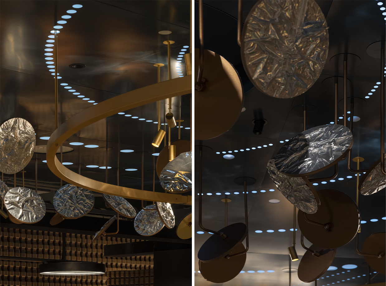 70块金属天花板面拼出了对宇宙星际的无限想象,于其上悬挂了81支仿若行星及陨石的圆盘装置。酒吧台被象征如日月盈缺的80片大小砖面,以渐递的方式完整的包覆。