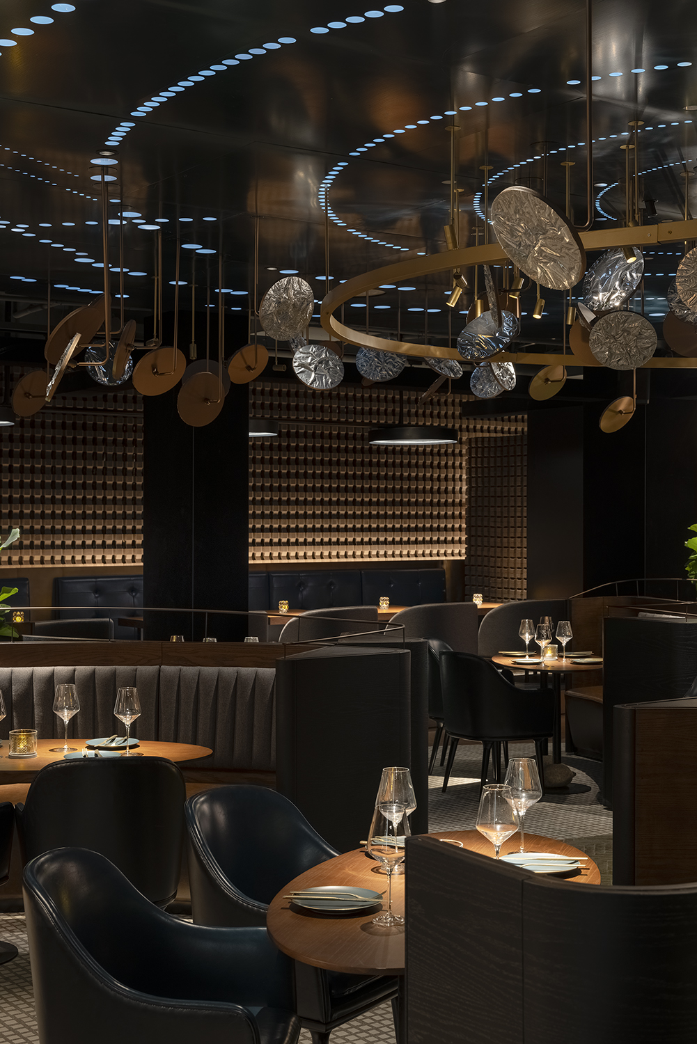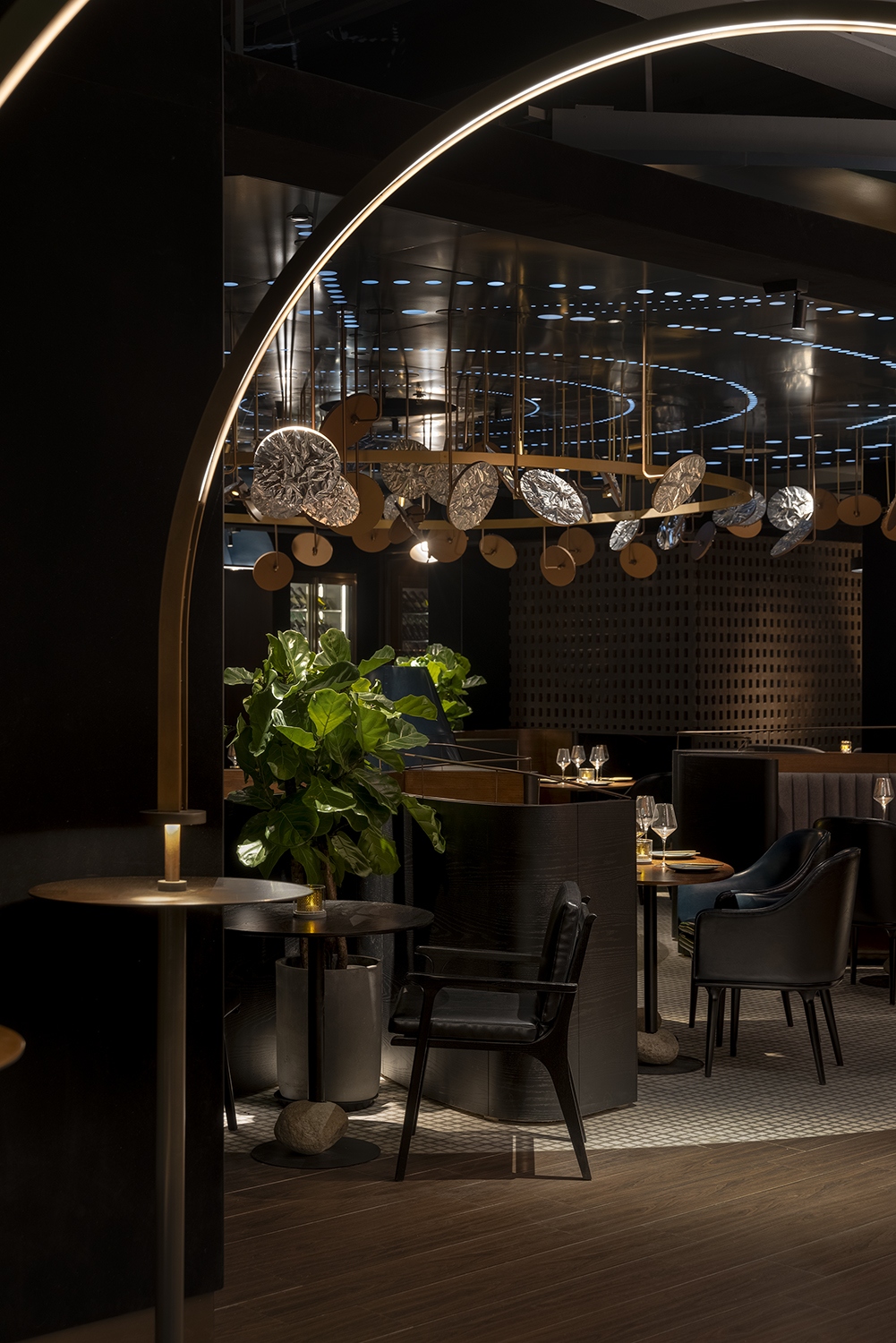 81支圆盘分布于中心用餐区的天花顶面,我们希望从任何的角度,都能看到不同的样貌,错落的高低 设置,暗喻了月亮阴晴圆缺的想象。