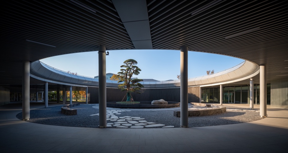 基于空间特质(桥、大台阶、圆形中庭)进行延展,借助自然元素(池杉林、水墙、倒影池、睡莲)营造空间氛围,并通过强烈语义符号点题:松果雕塑—果壳宇宙,罗汉松—智者,如是观圆环—万物生生不息。令人心领神会,留有想象空间。