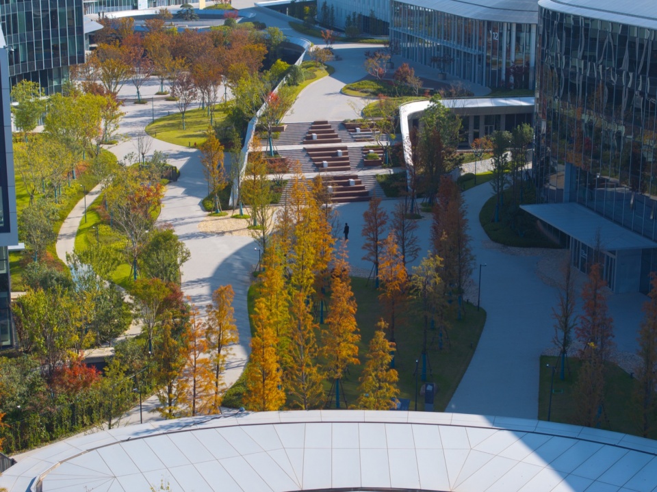 流线型水景小岛艺术化再现杭州“九溪十八涧”自然景观,加入岩石、枫树等自然元素,不同状态的跌级水景有利于人解压和夏季降温,给广场带来欢快气氛。园区道路实现机器人友好。使科技、自然、生活完美交融。