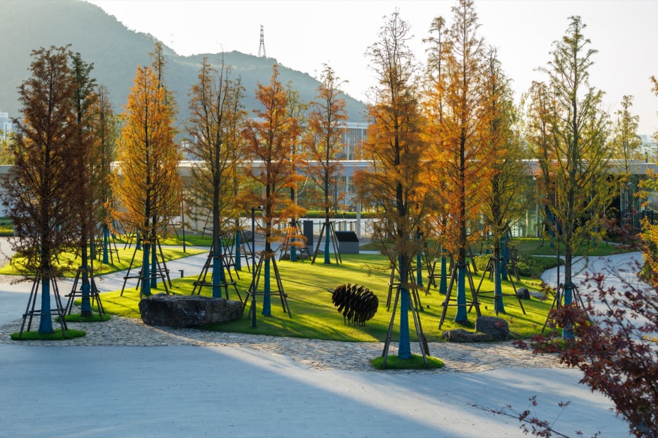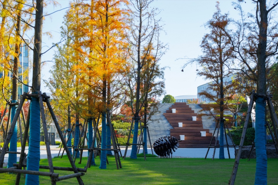 进入洒满池杉树影的园区,是可以远眺群山日落的果壳剧场,构思来自“果壳里的宇宙”,并以松果雕塑点题,果壳符号在不同文化中都是“有限中蕴含无限,微观中可见宏观”的象征。松果雕塑由回收金属制成,体现可持续理念,传递自然与艺术的融合,隐喻人类在有限物理空间中追求精神自由的永恒主题。