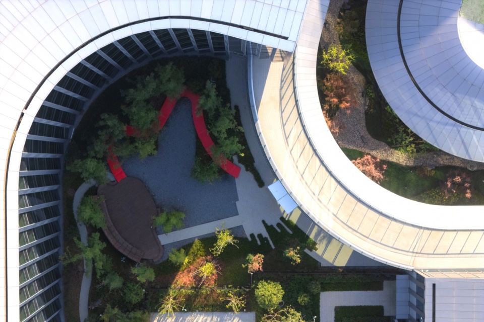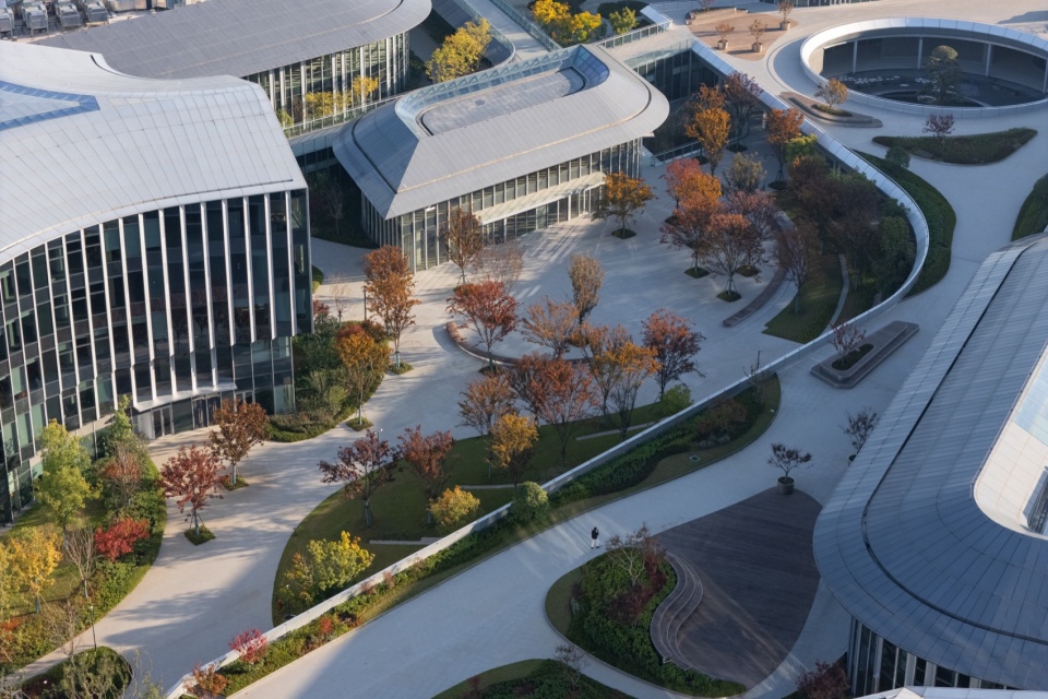 项目总占地22.8公顷,景观面积15.7公顷,树叶形状的空间结构形成建筑和景观互为图底的拓扑关系,为建筑创造最优的景观视线联系,也为内外景观的渗透带来先天优势。视线通廊控制、栖息地营造、慢行系统连接等多个设计策略联系园区内部景观和外部生态廊道,使场地同山水有机地生长在一起。