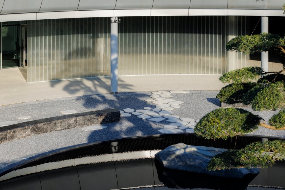 The curved water curtain wall hides some columns, provides directionality for the circle, establishes a profound background for the pine&stone picture, and shields the surrounding pedestrian flow. It divides the circular atmosphere into a 126-degree background area and a 234-degree viewing area, establishing the optimal viewing angle. This transforms the originally circulation-heavy courtyard into a quiet meditation space.