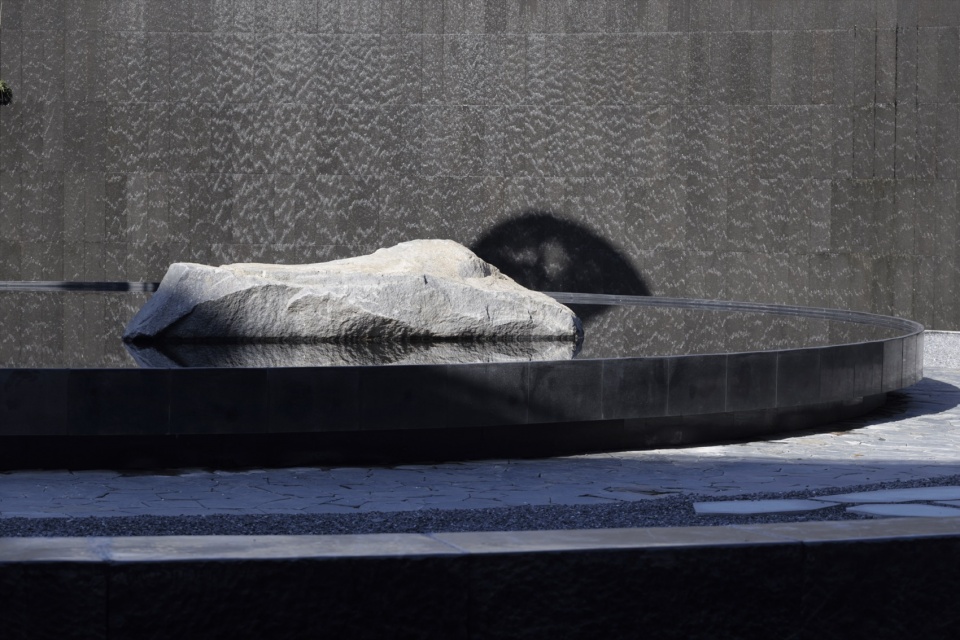 弧形水幕墙藏起部分柱子,为圆形提供了方向性,为松石画面确立了深邃的背景,屏蔽周围人流动线,将整个圆形氛围126°的背景区域,和234°的观赏区域,为对观确立了最佳的视野。使原本动线交织的中庭转变成安静的冥想空间。