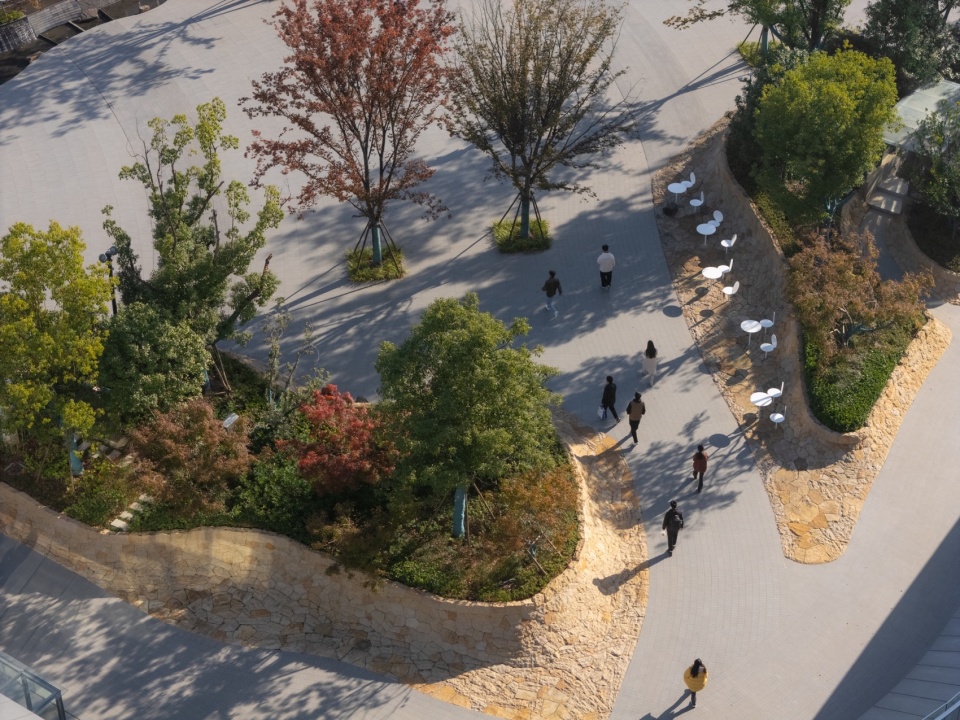 达摩环围合了整个园区的主广场,这里是园区重要的公共空间,需满足多种活动场景的变化需求。通过树岛界定出外围的散步环线和中央的弹性场地,并为建筑环廊提供连贯的优美窗景。模拟自然山林地形,通过巧妙的竖向设计将原本统一标高的广场,划分成4个有机边界的和缓台地,形成由高到低的观众区,更利于集会场景下的观演视线,弱化大面积铺装的枯燥感,整个空间简洁又充满变化,以最大的弹性应对日常和节庆场景切换。