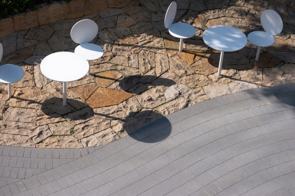 The recurring circular motif enhances the spatial sense of centripetality and spirituality. In Chinese culture, the circle symbolizes heaven and the cosmos. The circular opening of the courtyard also draws the eye upwards, following the cloud-form canopy of the Tree of Enlightenment towards the vast sky. The curved bench has a rough-hewn vertical surface, while its polished top adds play of light to the courtyard.
