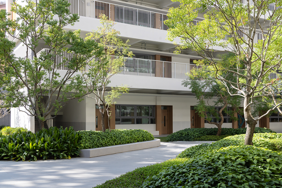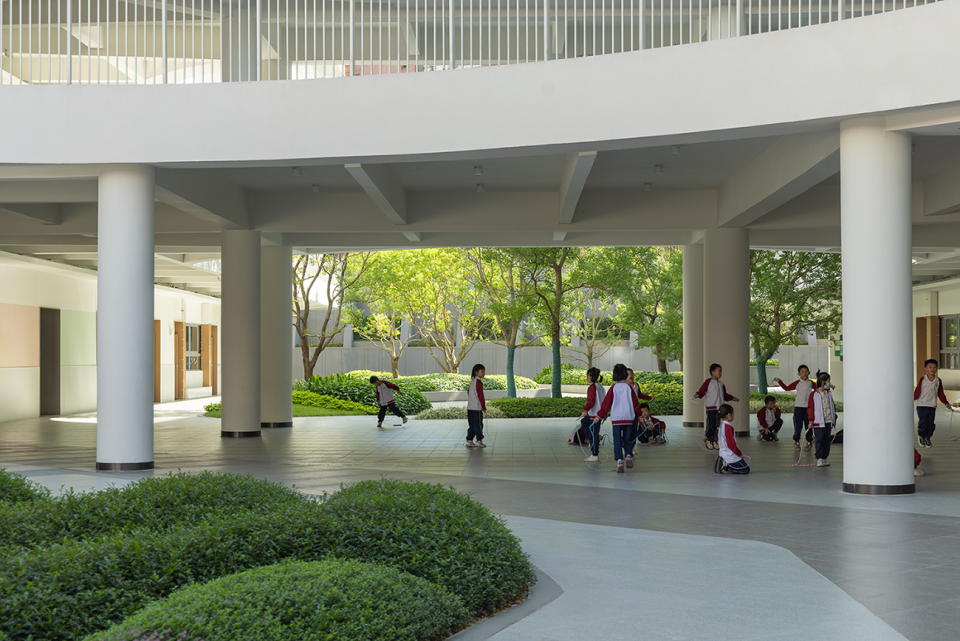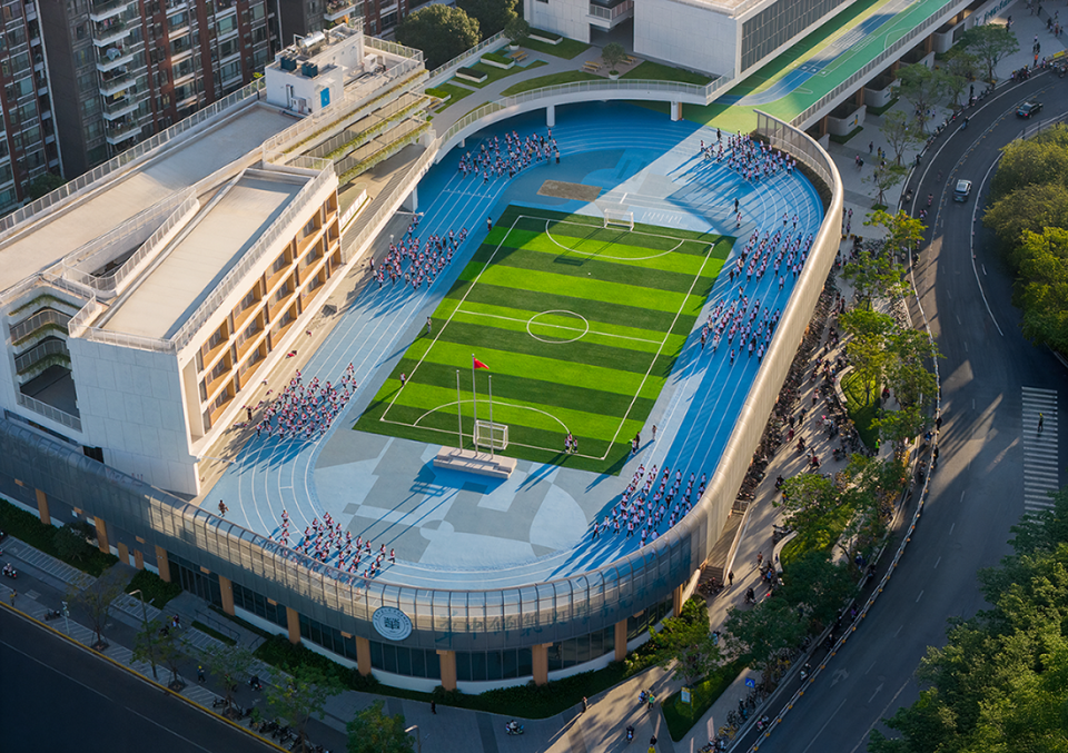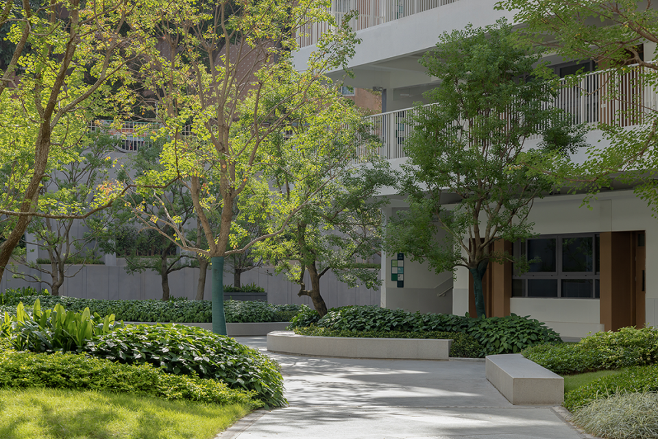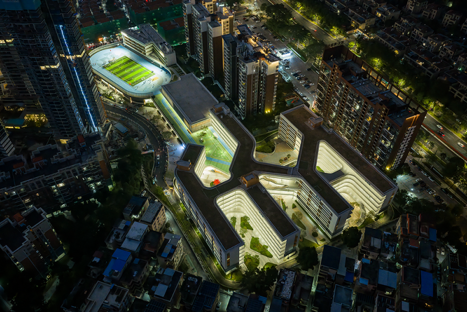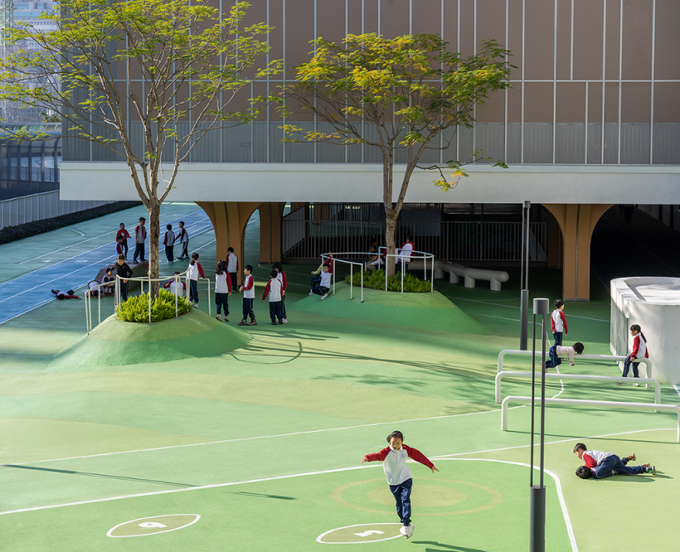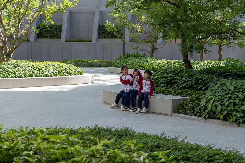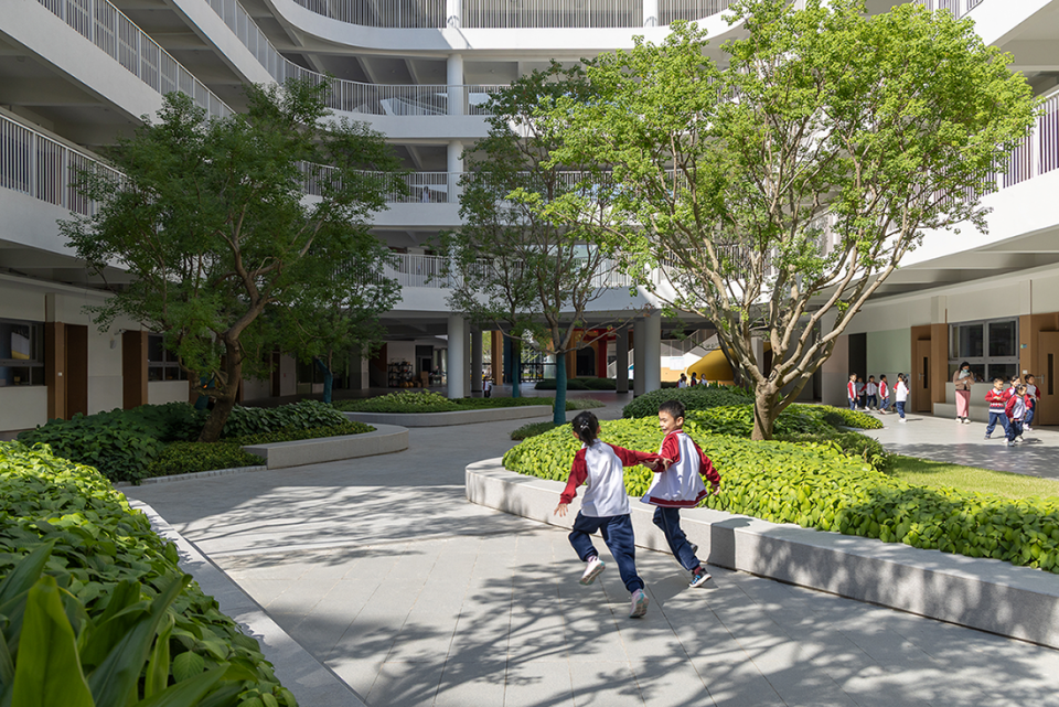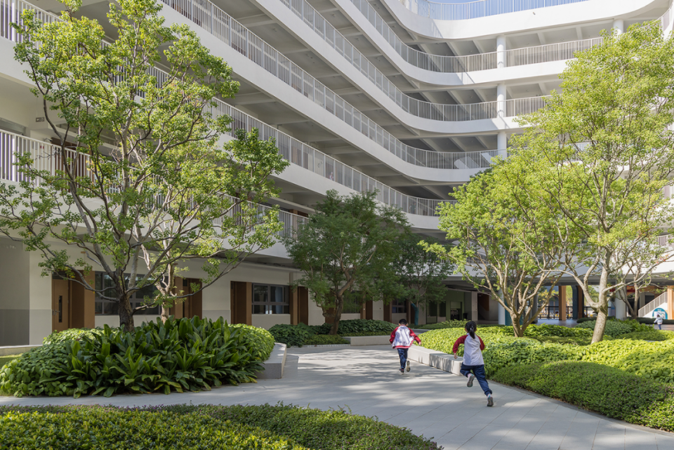 在城市高密度更新的语境下,基础教育空间往往被压缩为孤立的机能单元,如何使其重新承载社区凝聚力与自然教育价值,成为当代设计的重要命题。位于东莞东城街区的华中师范大学附属学校小学部,正处在这一现实挑战的前沿。我们将景观视作流动的纽带,使其在服务于师生的同时,成为激活社区交往与生态感知的公共精神载体。
