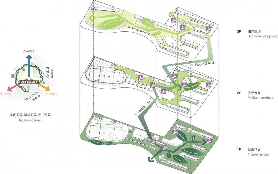 通过对华中师范大学校园文化的解读,景观概念结合校园风貌的阳光气质,以向阳而生的拾光之叶为载体,打造符合校园办学理念和学风校训的校园生活场景。利用景观色彩将学校整体的多维复合空间有机串联,在建筑空间内创造流淌的绿色空间,激活交通流线,高效链接景观多主题空间的同时,为教学楼注入趣味与吸引力,增强学生们的互动和活力。