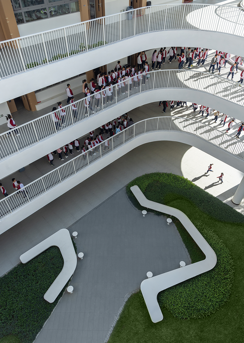 Adjacent to the library’s first floor is a tranquil oasis of knowledge, echoing the library’s learning atmosphere and creating several reading corners suitable for solitude or group discussions. Away from the bustling courtyard, this space provides children with an outdoor sanctuary where they can focus on reading, contemplation, and exchange ideas, amidst the interplay of light and shadow on the pages of books. The Enlightenment Corridor, located above the library, cleverly connects the open-air and semi-indoor spaces. The design incorporates light greenery and rotating geometric seating to create flexible and fun leisure spaces that inspire creativity and communication amidst the flow of light and shadow.