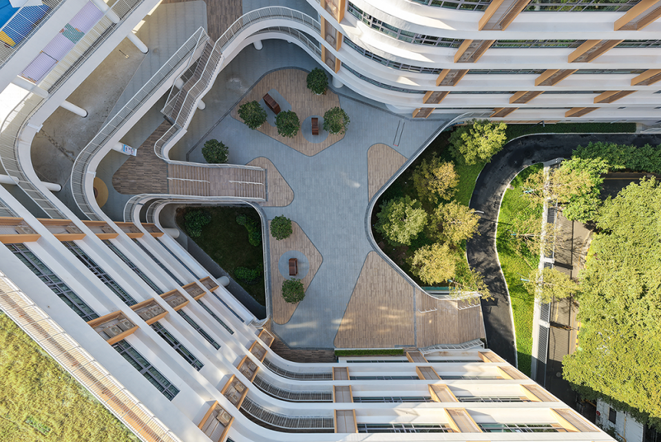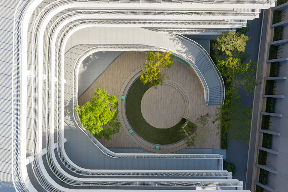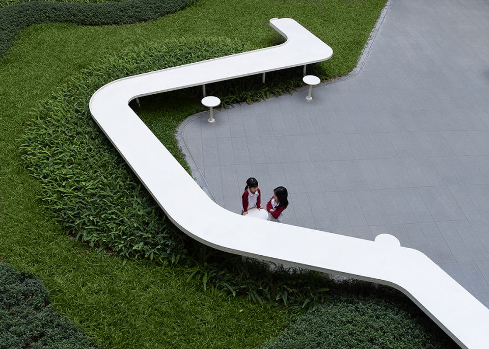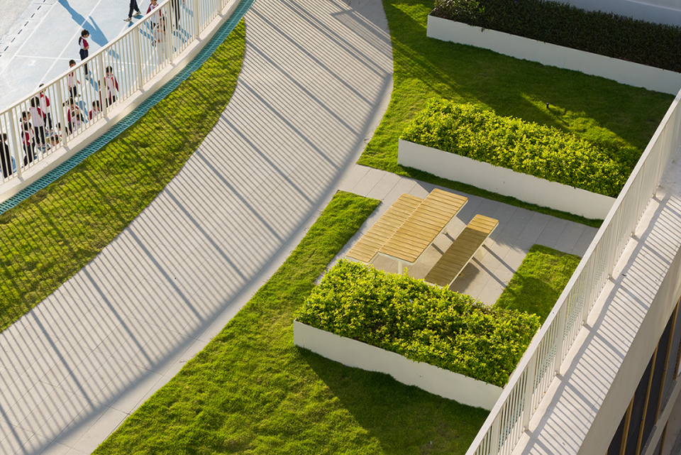 位于建筑4F的屋顶花园,巧妙结合简洁的植被与休憩桌椅,营造出一处宁静的空中绿洲。开阔的视野可于此俯瞰整个操场的活力全景,成为校园中畅享天空、阳光与远眺的放松之所。