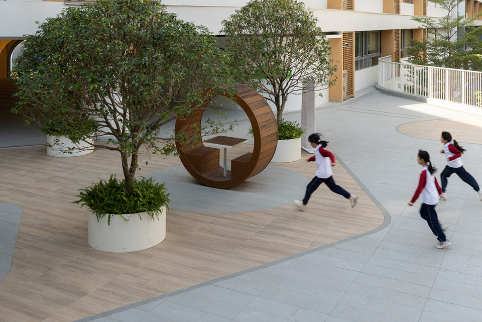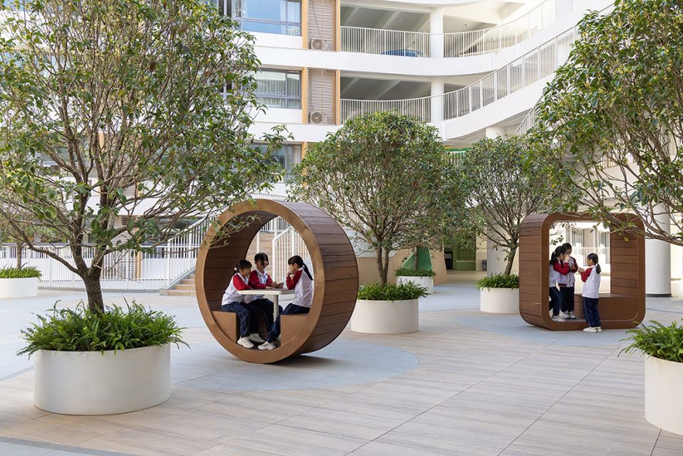 The social space features a log seating area built around existing trees, creating a natural, shady gathering point and providing students and teachers with a natural and welcoming outdoor social hub. Diverse study desks allow this space to support games, conversations, and small group activities, becoming an open container for nurturing peer relationships.