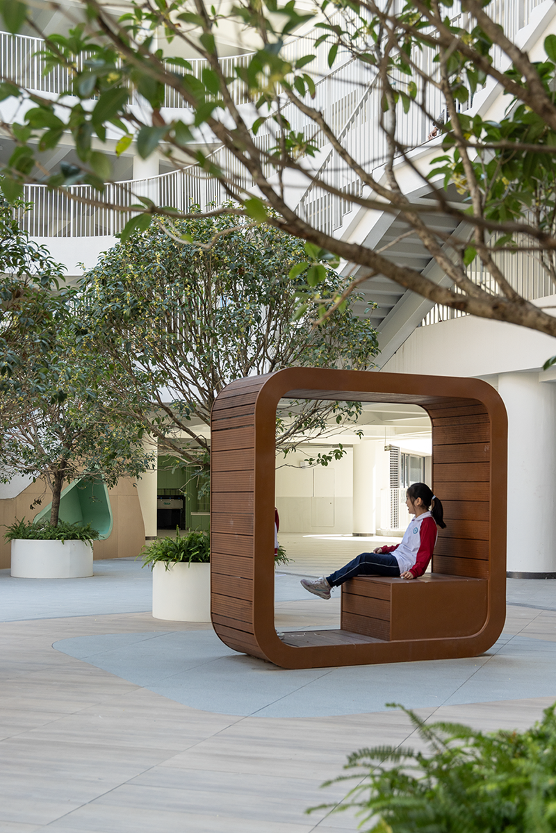 紧邻图书馆一层的阅读花园是一方静谧的知识绿洲,呼应图书馆的学习氛围,打造出多处适宜独处或小组研讨的阅读角落。这里远离活跃的庭院,在光影与书页的协奏中,为孩子们提供了一个能够专注阅读、沉思与交流的户外精神栖所。位于图书馆上方的启迪连廊,巧妙串联起露天与半室内空间,设计以轻盈的绿植点缀结合可旋转的几何座椅,营造出一个个灵活而富有趣味的休闲空间,在光影流动中激发灵感与交流。