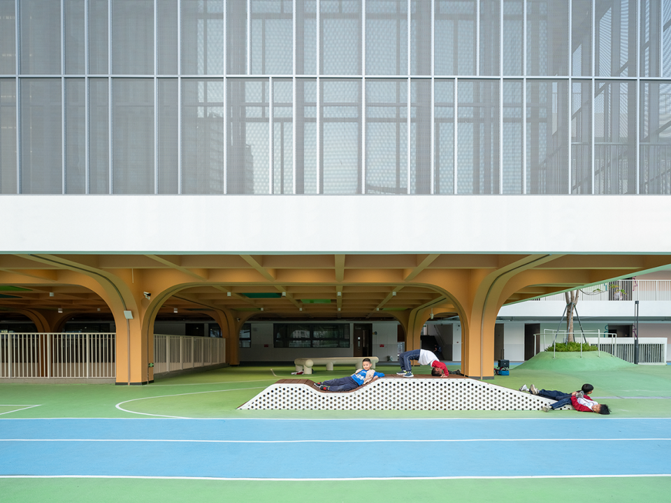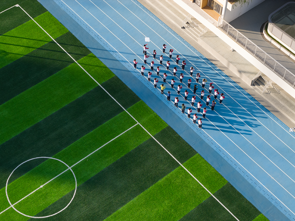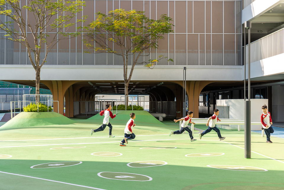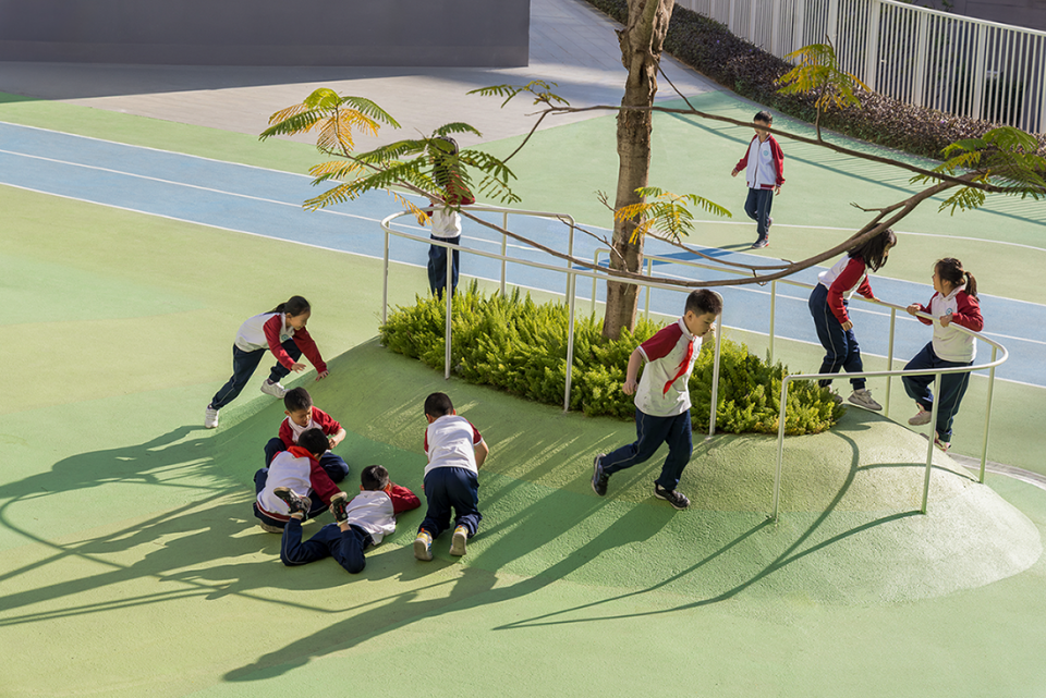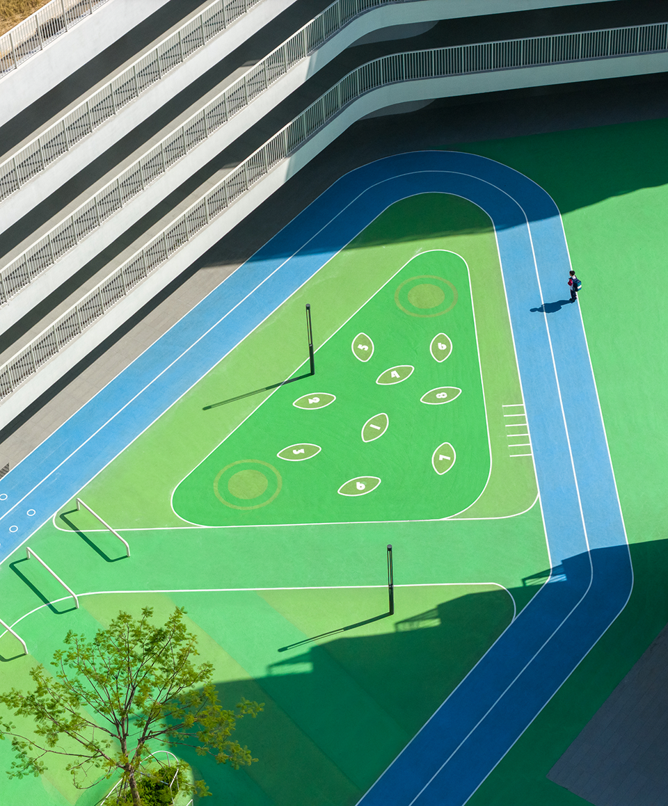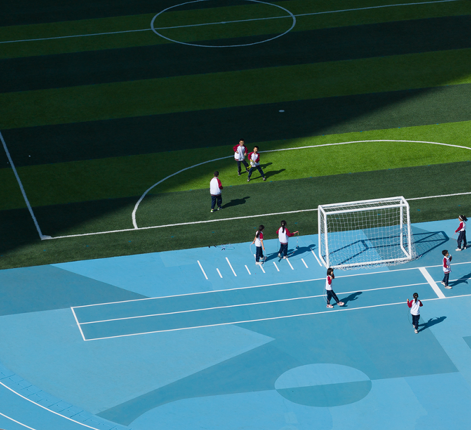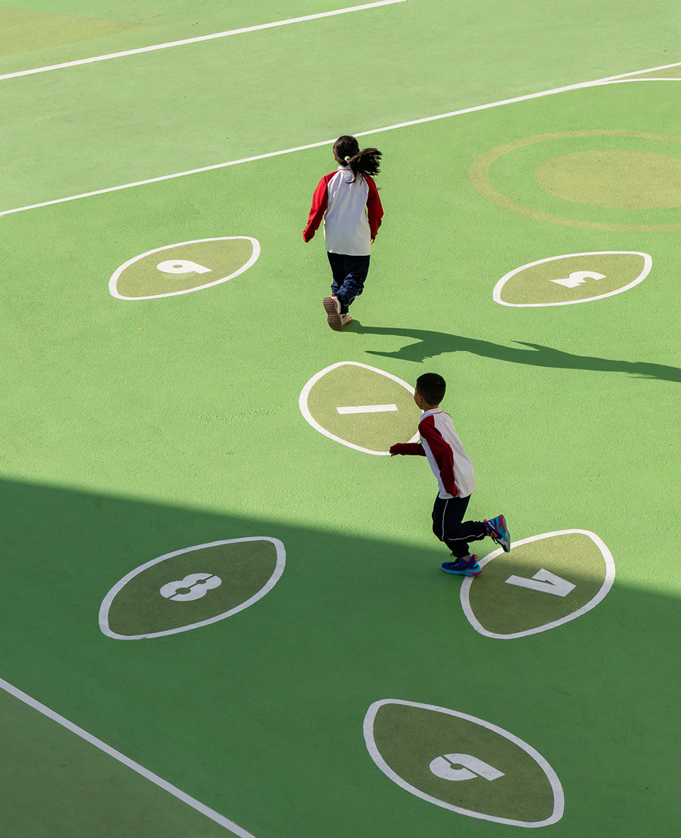 The Corridor serves as a vibrant link between the teaching building and the sports venue, transforming a frequently used passageway into a fun-filled activity space. Combining undulating terrain and leaf-shaped floor patterns, and flexibly incorporating facilities such as interactive lounge chairs, ping-pong tables, and running tracks, the corridor ensures efficient passage while also becoming a multi-functional space for students to release energy, engage in spontaneous games, and socialize during breaks. Through creatively designed themed lines, standard sports fields are transformed into imaginative play canvases. These lines not only define the functions of sports but also provide diverse informal game rules and social possibilities through pattern combinations, encouraging students to spontaneously organize activities and making the playground a dynamic social space brimming with boundless energy.