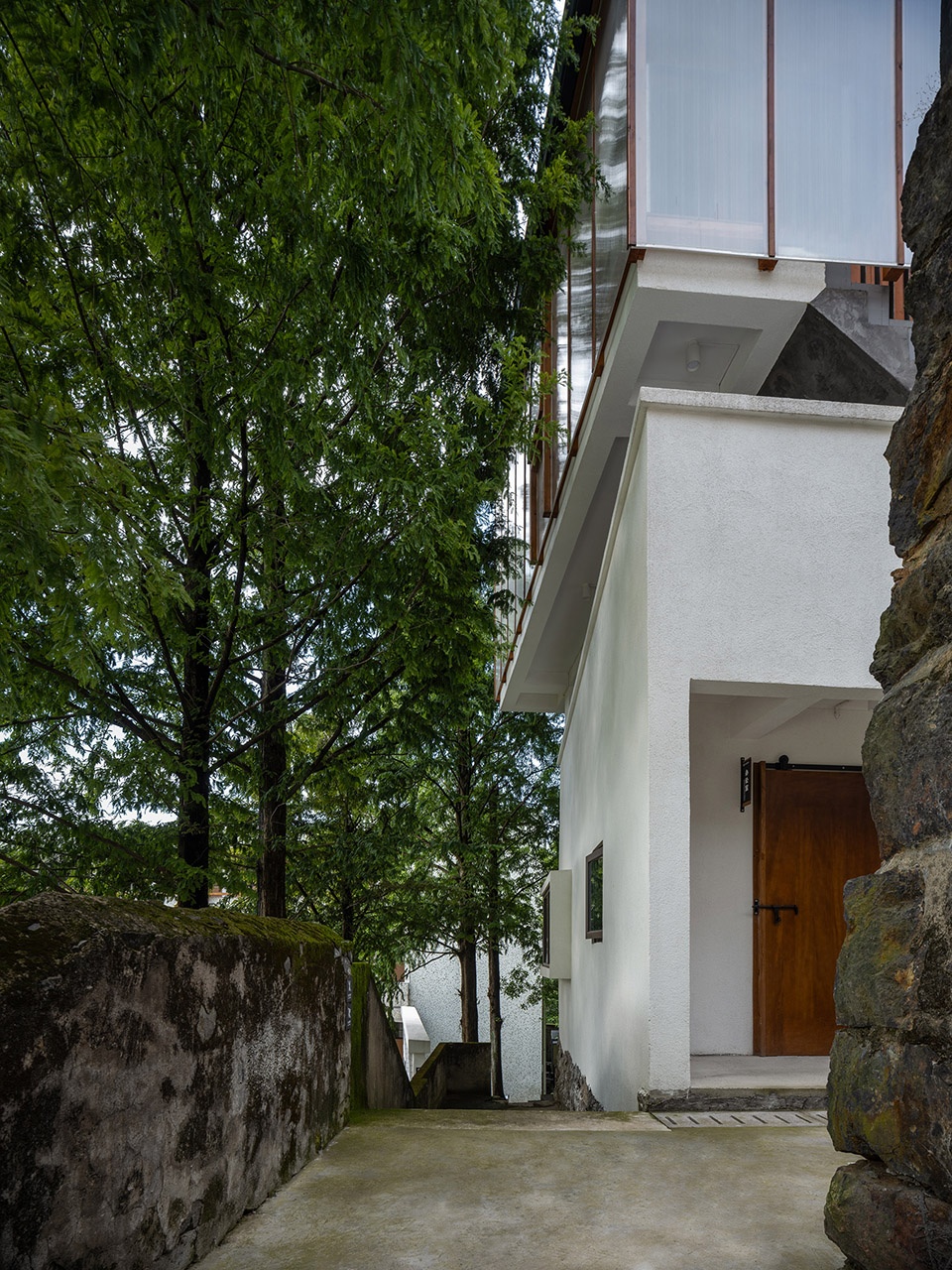 这个营地位于山林中,地势复杂多变。岗亭场地在两个台地过渡处,原本是一间学校办公室,入口位于低层台地,屋顶作为露台,与上一级台地对齐标高。层高随两阶台地高差自然确定,约有4米。