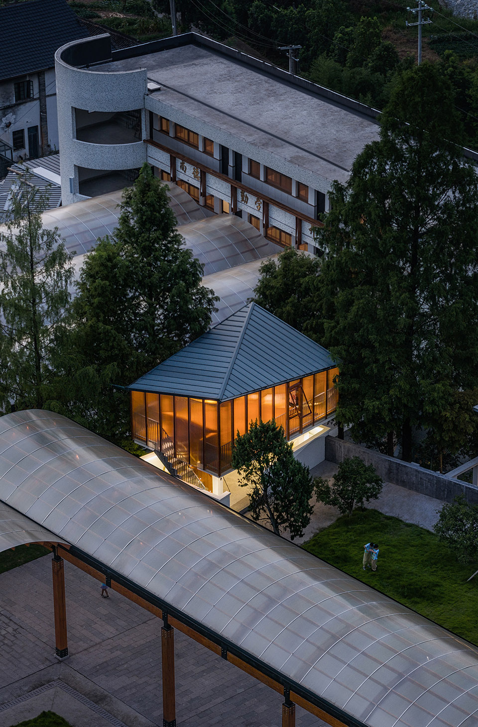 The Forest Pavilion is an adaptive reuse project located at the center of a rural study camp in the Shaoxing region of Zhejiang. Enveloped by a grove of dawn redwoods, lawns, and building clusters, the site forms a compact square of roughly 20 meters on each side.