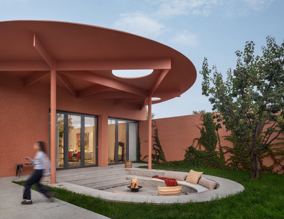 主房原有的窗台被拆除,改装为三米高的折叠玻璃门,与主花园区实现了无缝视觉连接。一个圆形钢制遮阳棚为北京炎热夏季中的南向立面提供了必要的遮阳,同时覆盖了下沉式户外座位区。一个石材装饰的圆形泳池和泳池平台为户外社交空间增添了点睛之笔。