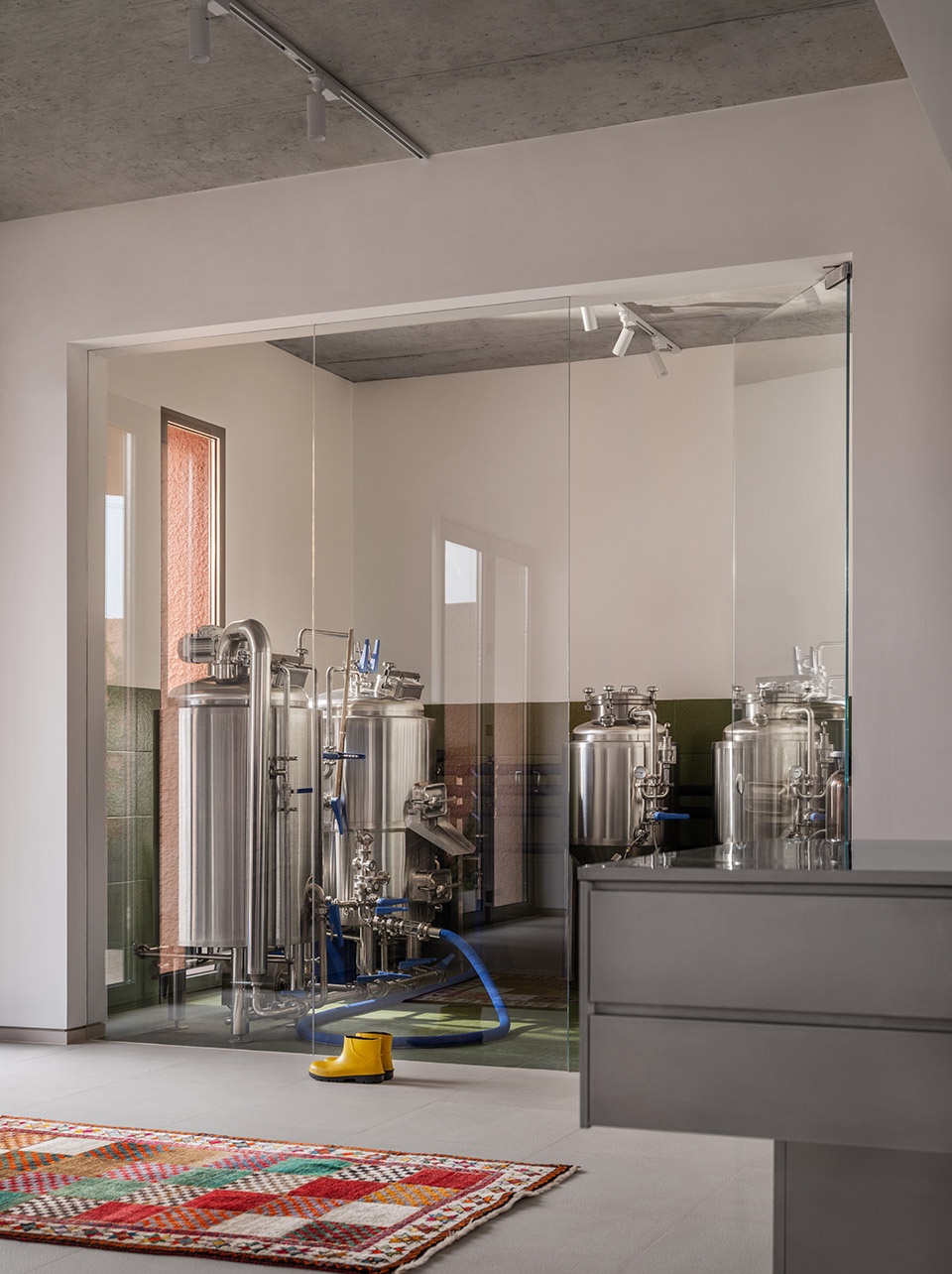 原有地块上有一栋180平方米的主房和一栋120平方米的小房子,还留下了270平方米的户外花园空间。主房经过拆除和加固后,保留了简单的柱体和板状结构,主要作为灵活的开放式生活空间。通过大玻璃隔断与生活区分开,一个设备齐全的酿酒室正对着客厅,成为展示酿酒工艺的区域。三台100升的酿酒罐可以酿造各种啤酒,从皮尔森、拉格到IPA,甚至无酒精啤酒都不在话下。