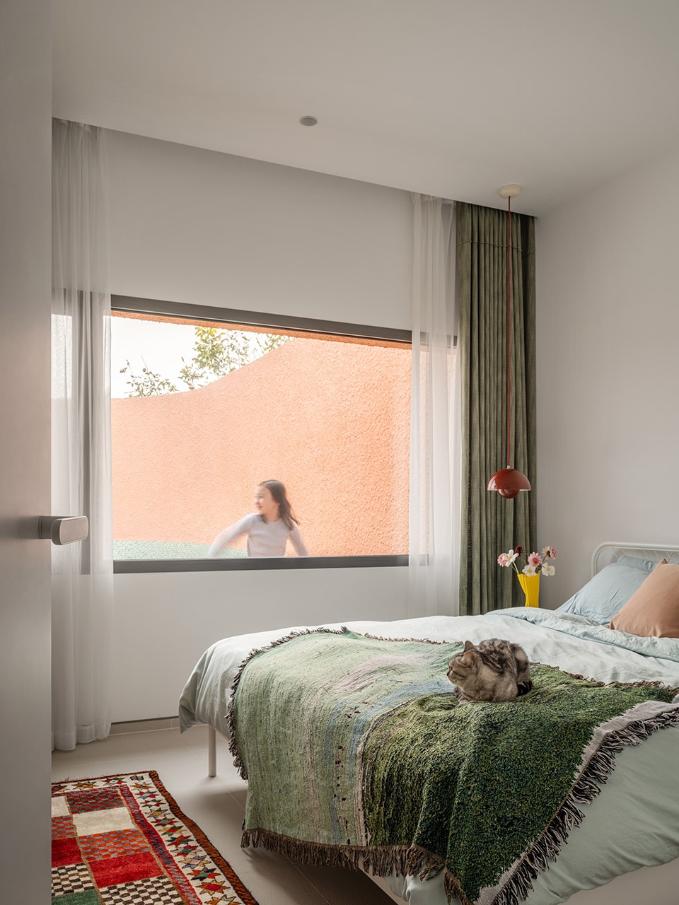 While a master-bedroom suite is part of the main house, the smaller house on the north side of the plot serves as a generous living area for the child of the family and guests. The children’s room, guest suite, and the connecting hallway have framed views into two small private gardens.