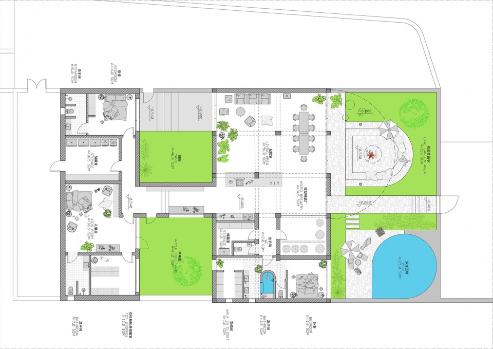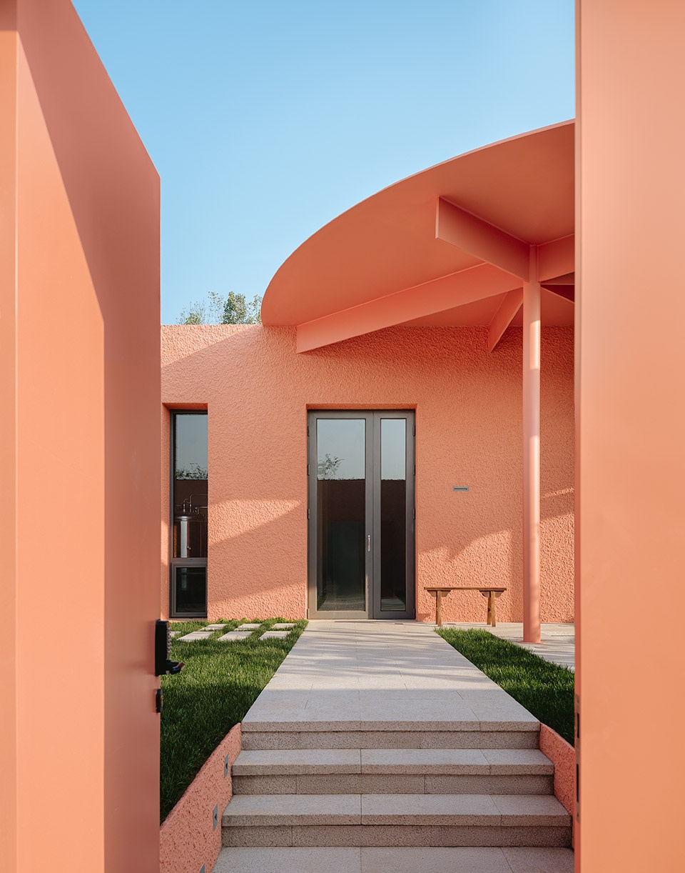 The upstands of the existing window openings of the main house were demolished and filled with three-meter-tall folding glass doors to provide a seamless visual connection with the main garden area. A circular steel canopy gives much-needed shading to the south-facing façade in Beijing’s hot summers and covers the sunken outdoor seating area. A circular pool with a stone-cladded pool deck completes the outdoor social spaces.
