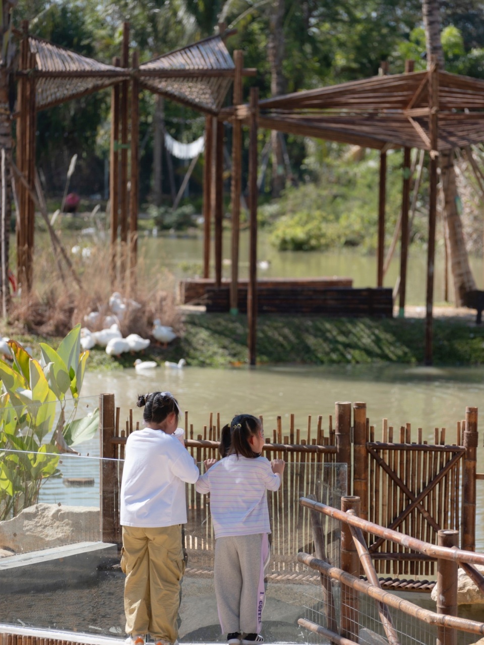 水禽们的生活习性是非常依赖水域,并且擅长游泳、行走和飞行,为了它们在园区能更好生活,三处水塘相邻相依,中间由自然路径串联,环水布置了不同种群动物的“家”。当然,偶尔它们也会串门,也会大摇大摆到景区门口去看看今天又有哪些人类进家里来做客了。