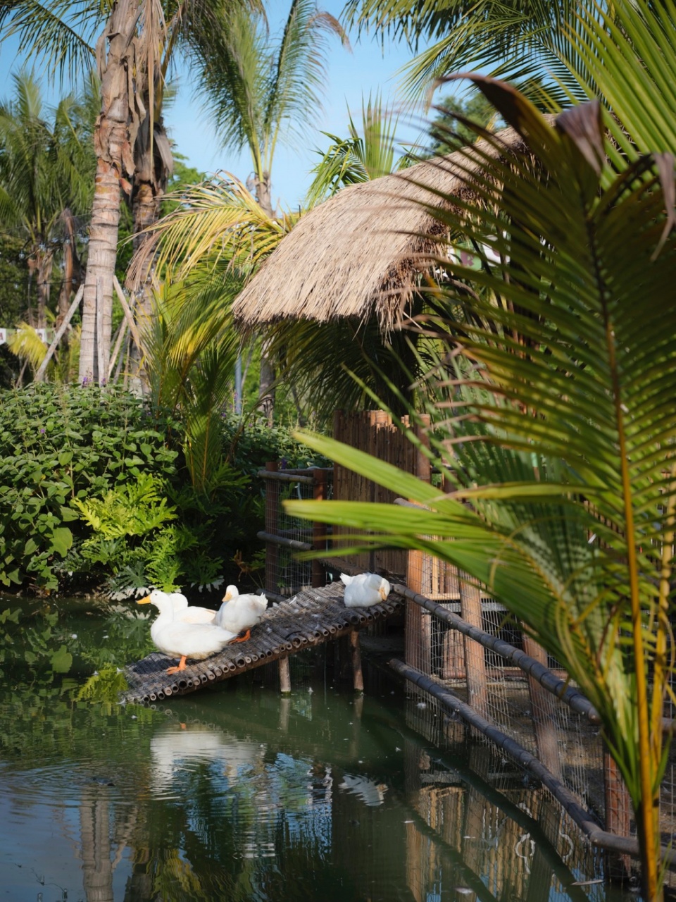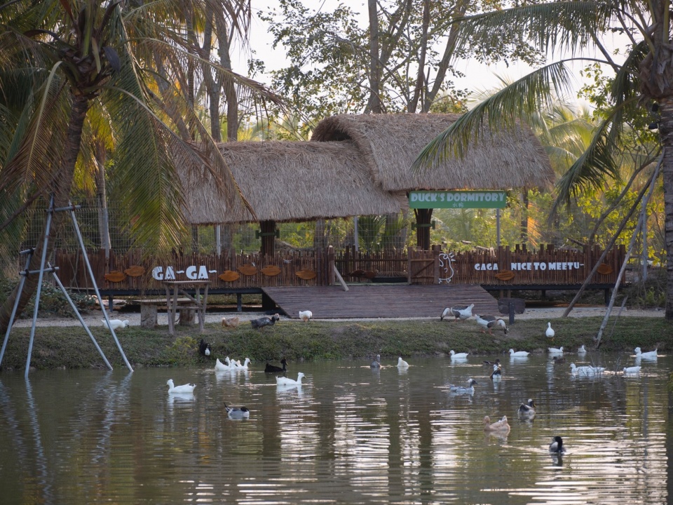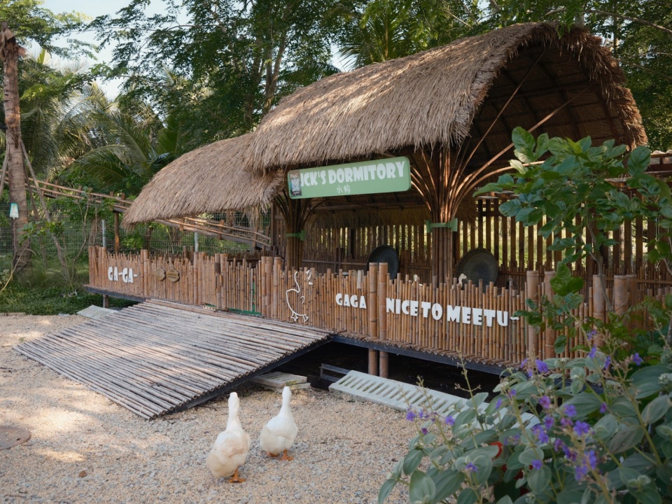 因为水禽们昼夜节律的生活习性,目前园区内饲养水禽多数为日行性动物,且有极强的群居习性。晨昏时分,种群的庇护所——“家”就非常重要,我们为此研究了适应当地气候的窝棚形式。遮风挡雨的同时透气通风,并且方便“套内直达泳池”。