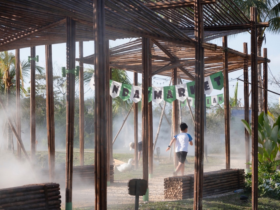 在本次场地设计中,我们在研究多种材料和结构形式后,选定竹来作为主要材料,取材轻便,善于造型,环保耐用。在细节上,也尝试用彩色钢质构建提升稳固性和细节造型,作为放野中带着一定设计感的元素。利用本土元素进行设计和建造,也尽量贯彻低介入的设计原则,传承在地传统,新旧工艺互相穿插,生生不息。