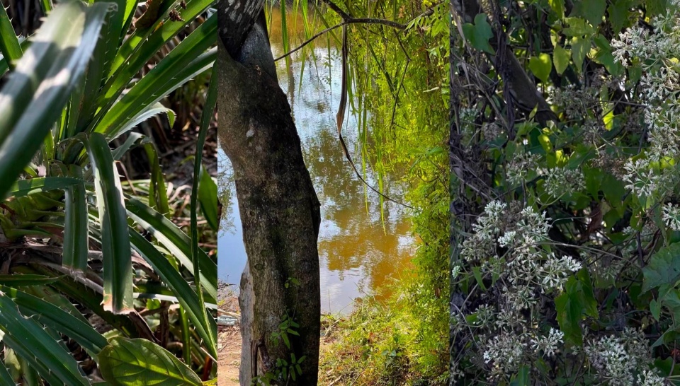 ▼现场原生野菠萝与白鹭,现场小溪中自然生长的芋头,现场原生乔木与寄生藤曼,Native Wild Pineapple and Egret on Site,The Naturally Growing Taro in the Site’s Stream,Native Arbor and Parasitic Vines on Site