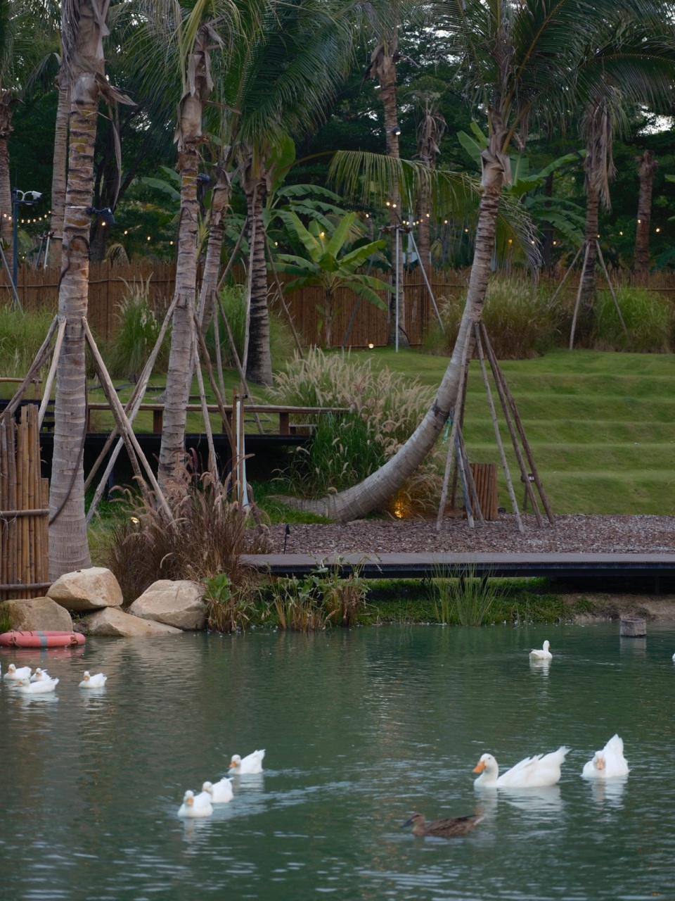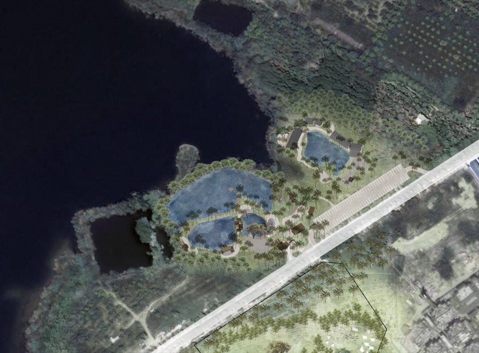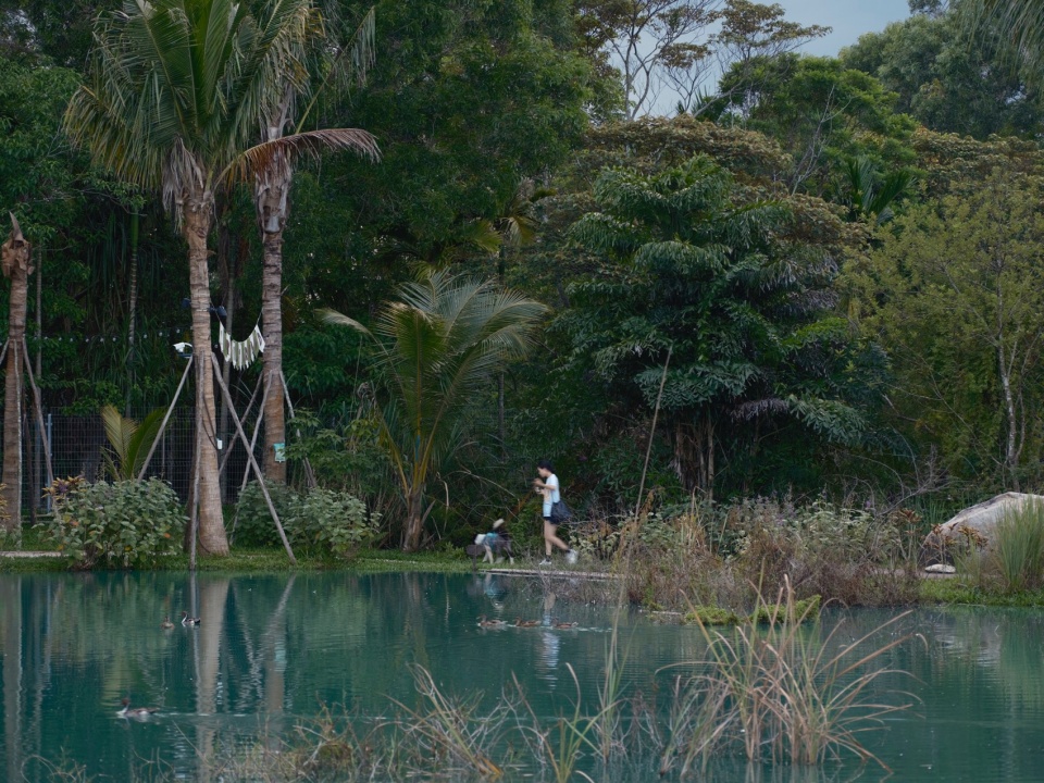 项目位于万宁碑头水库畔,与之一路之隔的是前序落成运营的麓湾牧场。在这片椰林间,计划利用天然坑塘形成的三处大小各异的“水鸟乐园”,另有一处水塘则环水布置各色餐饮、互动业态,串联起各林下休闲空间,与坡地上的麓湾牧场遥相呼应,形成集特色南洋餐厅、水上运动、亲子研学、休闲度假、文化社交为一体的海岛丛林放野度假旅游目的地。