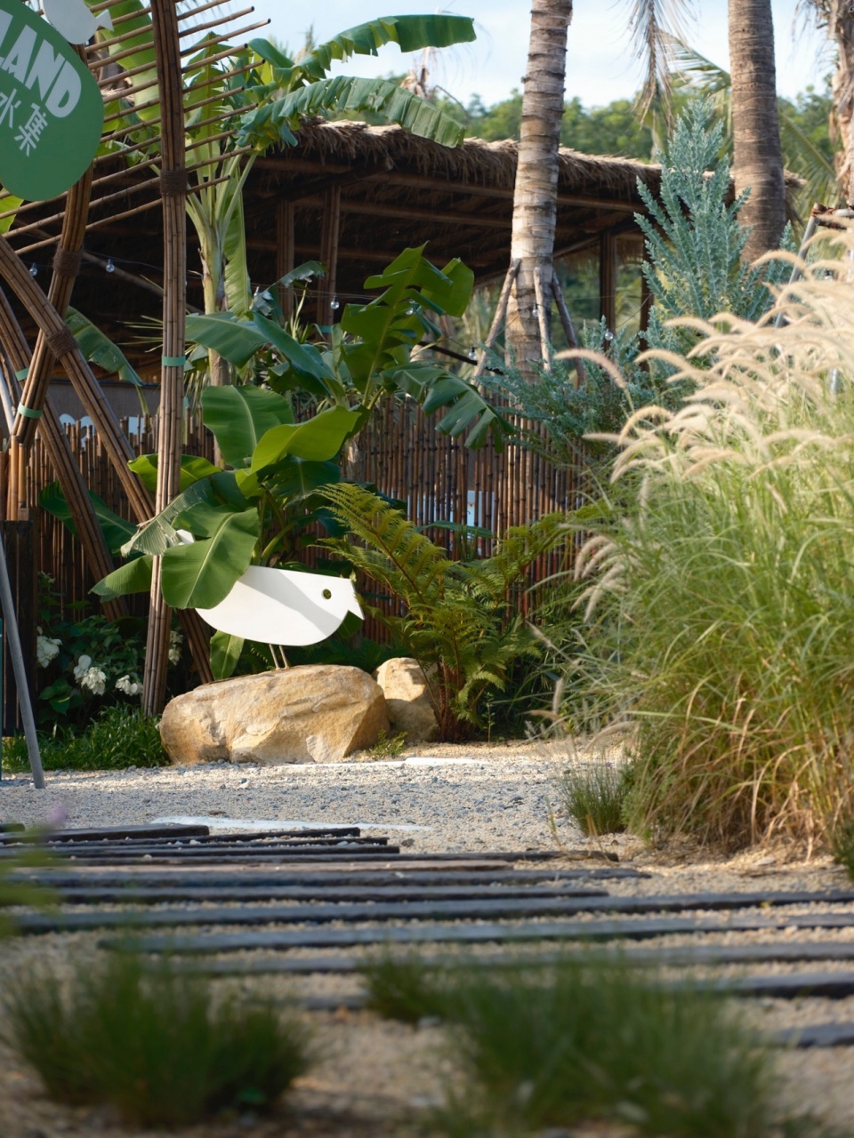 园区环境材料的利用上,我们则因地制宜,用轻质的原生在地材料做地面铺展。于大草坪区域采用盲管排水的方式实现无硬化基层,保证地面自然渗透、无积水的效果。整个园区利用环保耐久的砾石做园路,达到自然排水自然渗透。再局部区域利用竹木平台实现休憩空间的干燥耐候等使用条件。