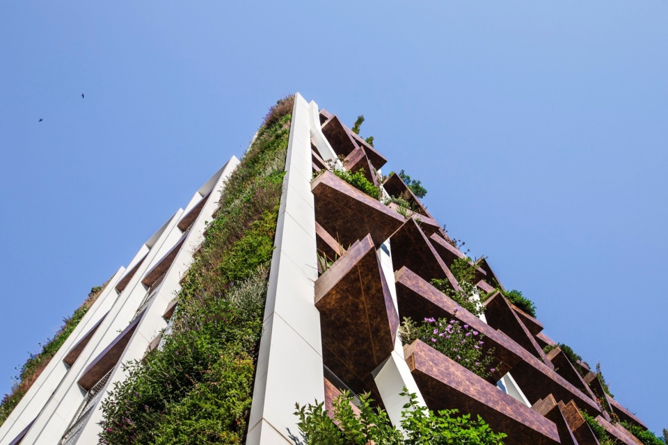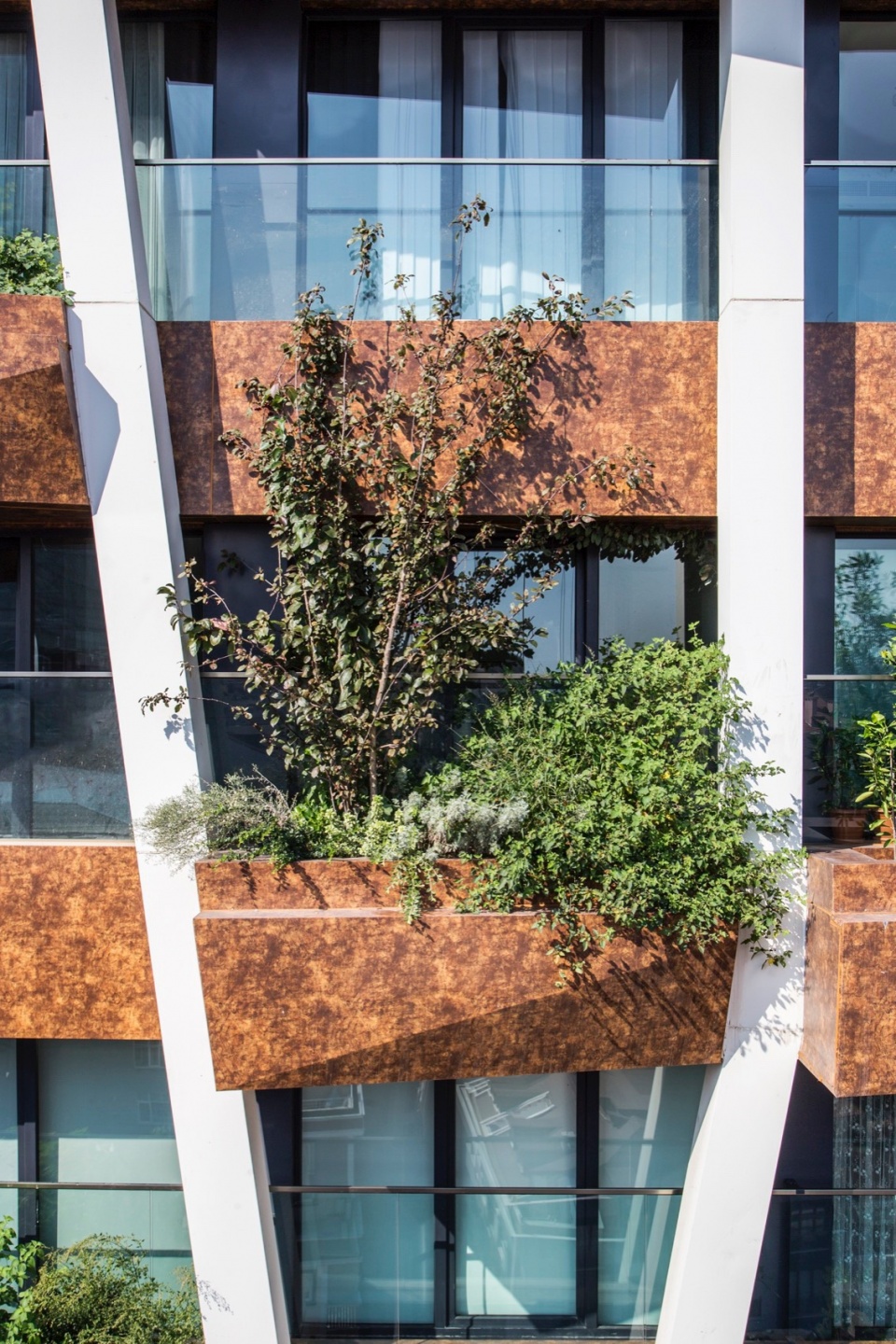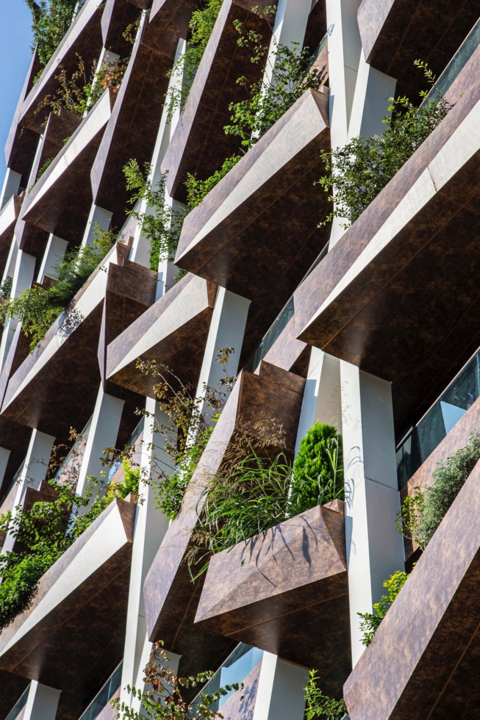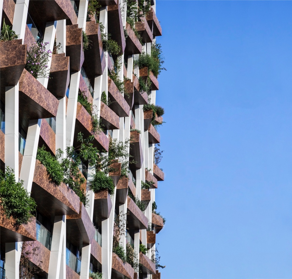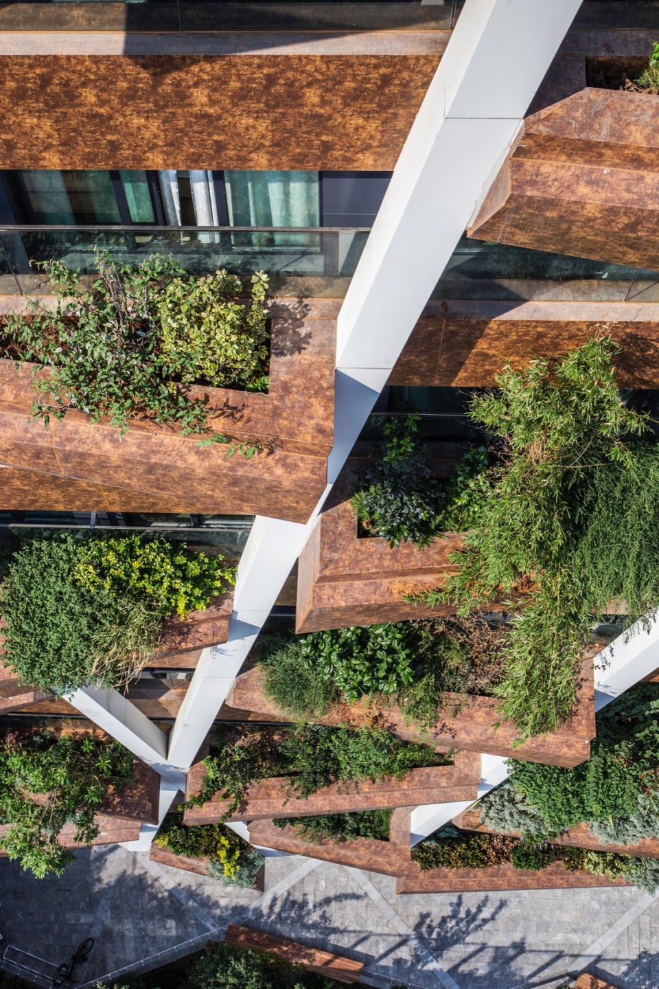 立面结构以树枝的意象为灵感,构成了建筑最主要的建筑表达,并通过将与绿色的联系从二维延展至三维,形成一层绿色外壳,从而高效利用场地。建筑基底被整体抬升,营造出一处景观化的社交屋顶;同时,项目还突破自身用地边界,对相邻公园空间进行重新组织,构建出与周边环境无缝衔接的地面层。建筑立面共引入900株乔木与灌木以及25,500株植物,使 Greenox成为一座每年可产生约2,373立方米氧气的绿色建筑。