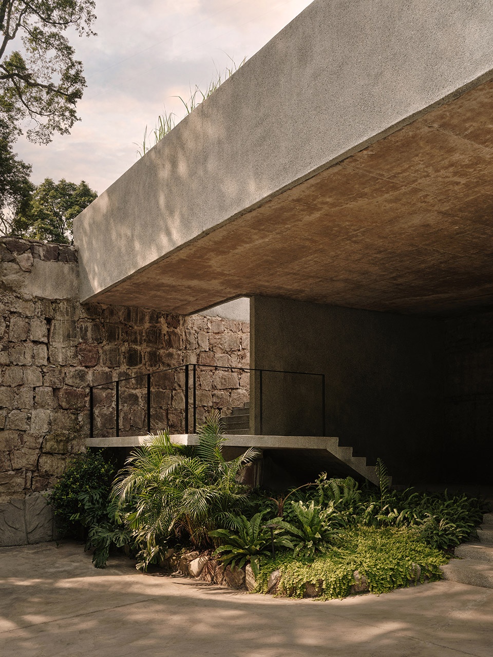 At the entrance, the façade is formed in hand-chiseled textured concrete, its raw tactility grounding the architecture in permanence. This crafted surface establishes an immediate sense of material authenticity and timelessness.